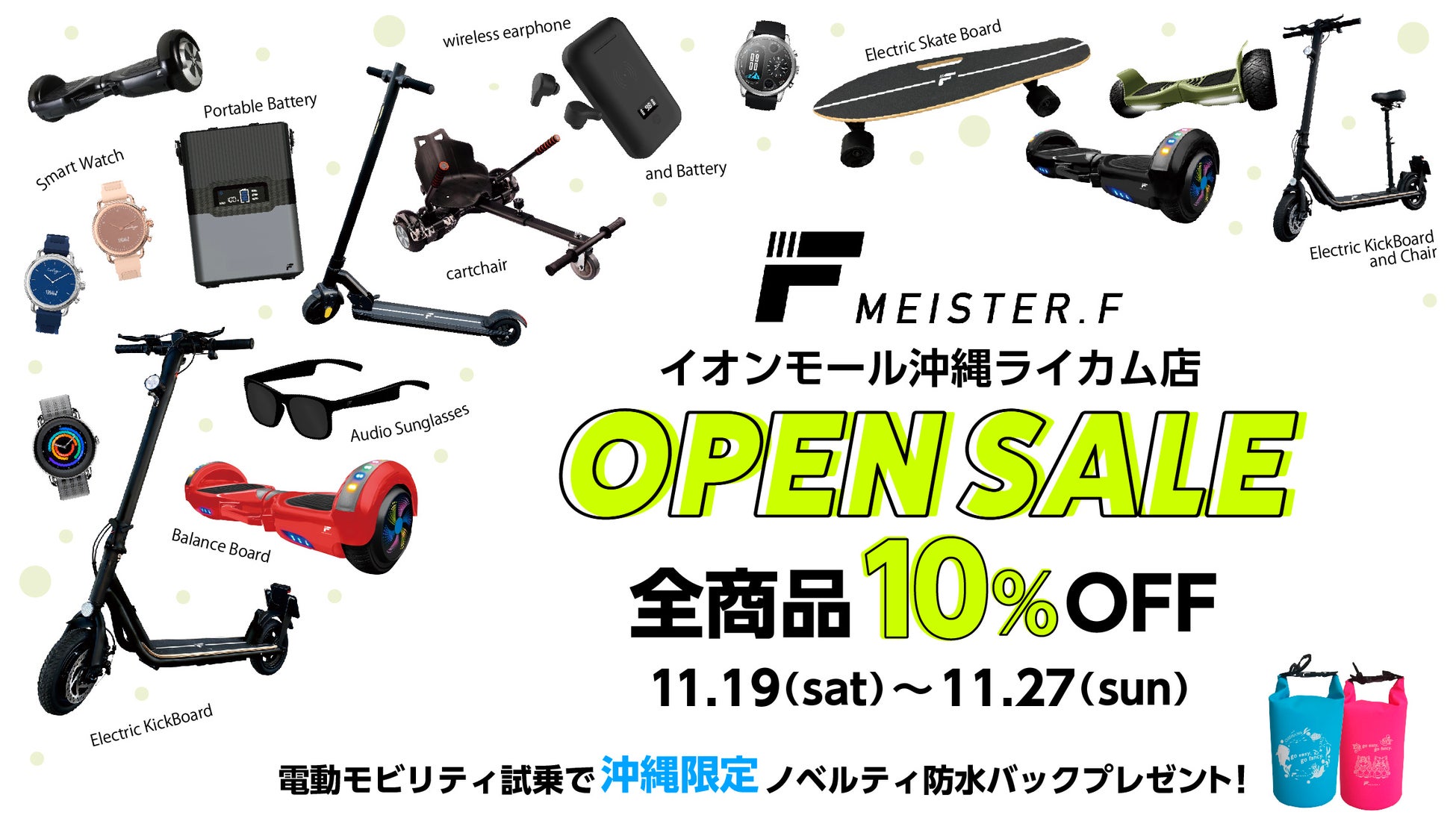 11月19日(土)から11月27日(日)まで、公道走行対応モデルの電動キックボード、重心移動で運転をコントロールする電動バランスボードなどの電動モビリティや、ワイヤレスイヤホン・スマートウォッチなど最新ガジェットの全商品10%オフ、オープニングセールを開催します。また、電動モビリティのご購入で、最大10,000円相当のプレゼントがもらえるキャンペーンを実施します。さらに、電動モビリティをご試乗頂いたお客様には、沖縄県限定モデルのMEISTER.Fオリジナル防水バックをプレゼントいたします。