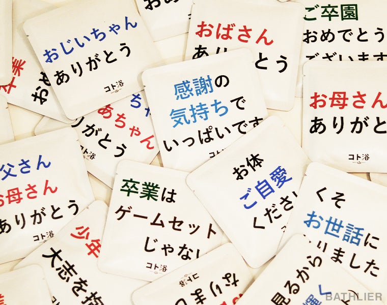 「言葉を浴びる」「言葉に浸かる」「言葉を贈る」を融合させた新浴感※ 。 入浴には古くから温泉浴をはじめ、サウナ浴やシャワー浴などいろいろな種類があり医療や衛生的な健康習慣として広く認知されてきましたが、そんな入浴に気持ちを伝える「言葉」をプラスするから「コト浴」なのです。日持ちがするから贈る時期を選ばず、プチプラギフトとしても手頃でそのまま渡してもかわいいパッケージ、 贈らない理由が見当たらないほどオススメしたいお風呂のソムリエ(バスリエ)からの提案です。