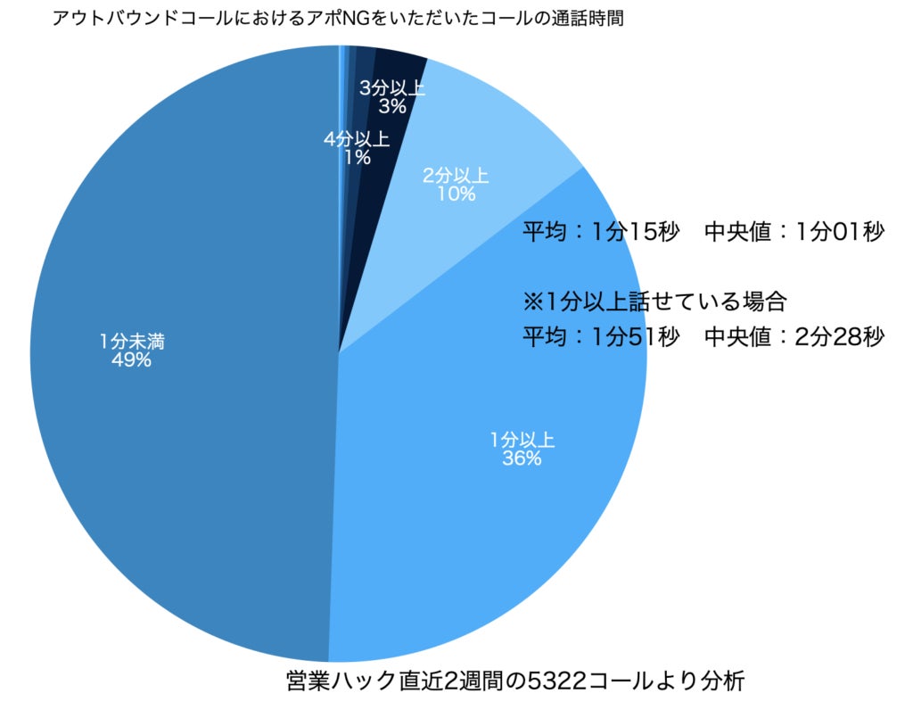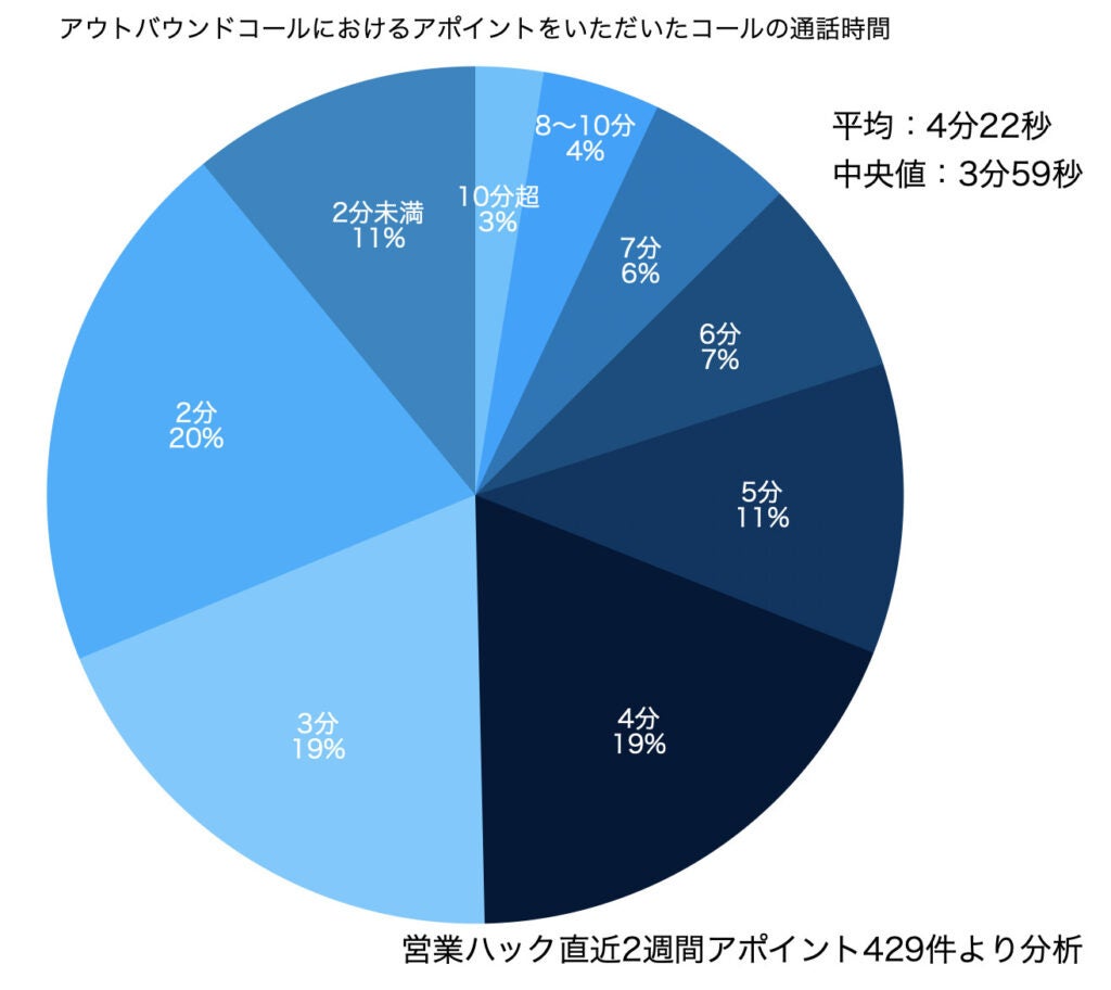 営業ハックでは営業支援業務の中で、テレアポ代行を行っています。その中で社内メンバーによる調査を実施したところ、アポイントが取れたテレアポの会話は「ほぼ4~5分程に収まっている」というデータが計測されました。