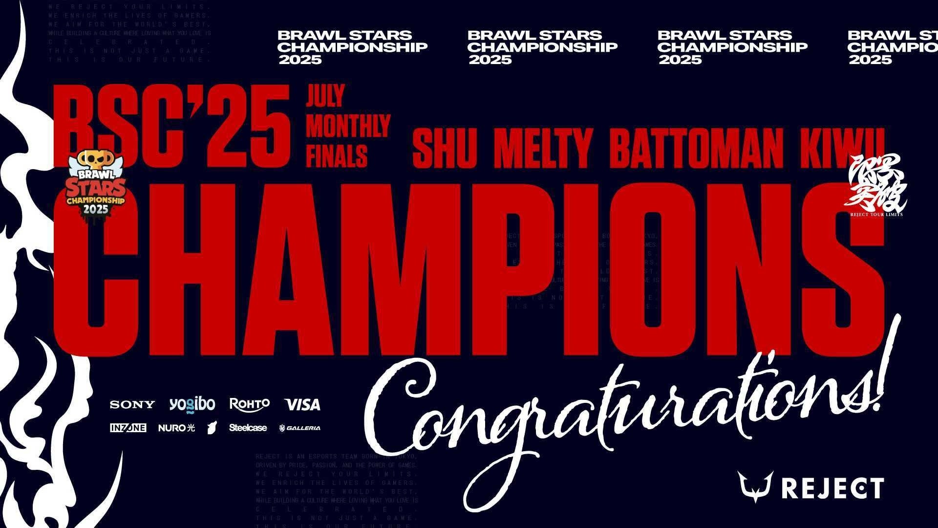 株式会社REJECT(本社:東京都港区、代表取締役:甲山翔也)が運営するプロeスポーツチーム「REJECT」Brawl Stars部門が、2025年7月12日(土)に開催された『ブロスタ チャンピオンシップ 2025東アジア 7月マンスリー決勝戦』にて優勝したことをお知らせいたします。