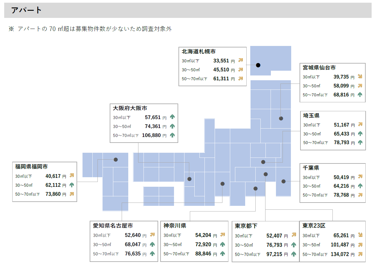 <2022年8月 全国主要都市における賃貸マンション・アパートの平均家賃(面積帯別)>