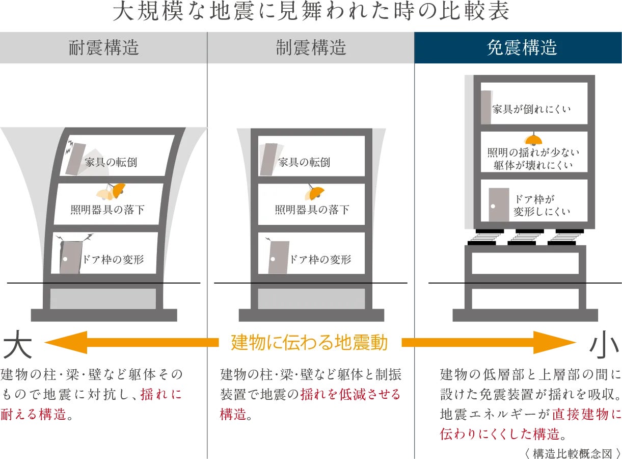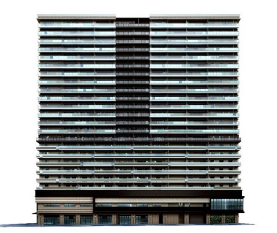高さ約80m、地上23階建て、総戸数491戸の大規模タワーマンションとなる本物件には、2階と3階の間に免震装置を設置した中間層免震構造を採用しました。基礎免振に比べて免震装置の引張力を減少させ、揺れへの対応力を強化しています。また、3階~23階の住居フロアには各階に防災備蓄倉庫を設置し、災害時の入居者の安全を確保します。