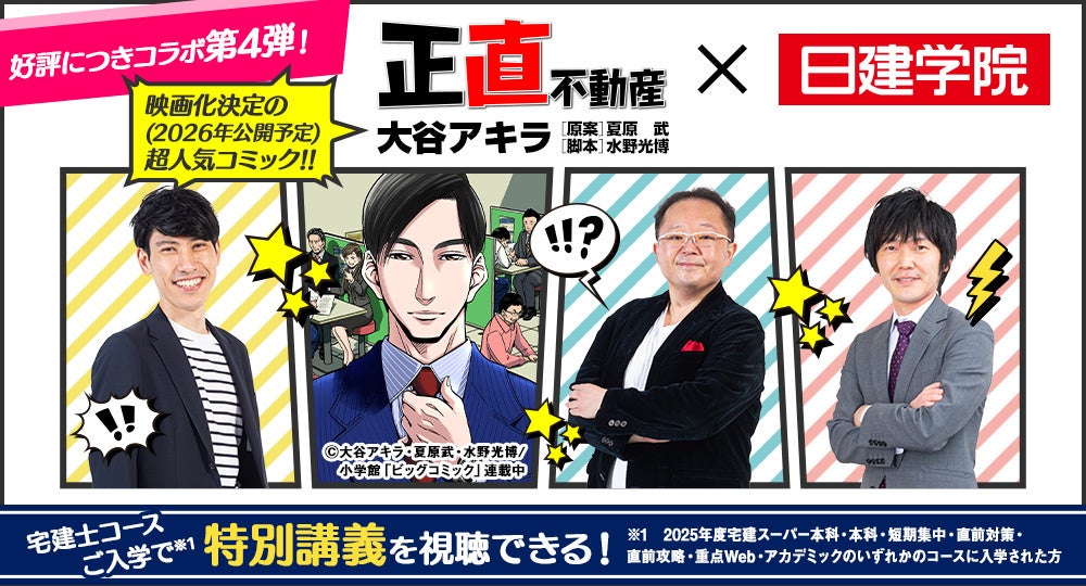資格取得支援スクールの日建学院を運営する株式会社建築資料研究社(所在地:東京都豊島区、代表取締役社長:馬場栄一)は、2025年度宅地建物取引士の対象コースにご入学された方へ、小学館「ビッグコミック」にて連載中の漫画『正直不動産』(漫画・大谷アキラ、原案・夏原武、脚本・水野光博)とコラボした特別講義を配信いたします。「宅建本試験ではどう出題される?」「宅建本試験に役立つポイントとは?」など、漫画の具体的なテーマを基に民法や宅建業法など難解な法律を解説いたします。
