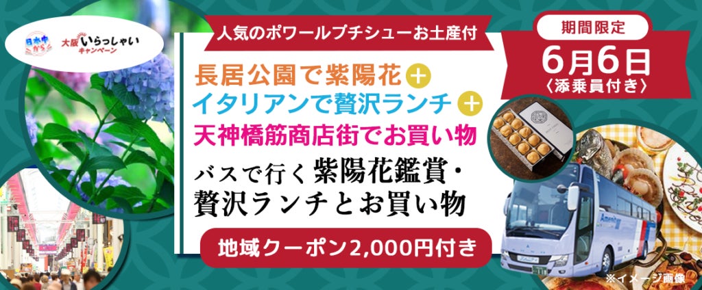 《大阪いらっしゃいキャンペーン》6月6日(火) 長居公園で紫陽花+ 堀江でイタリアンランチ+ 天神橋筋商店街でお買い物 バスで行く 『紫陽花鑑賞・贅沢ランチとお買い物』※人気のポワールプチシューお土産付 ※