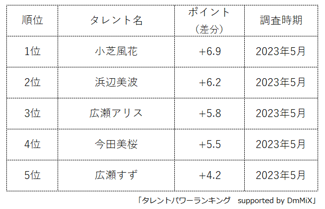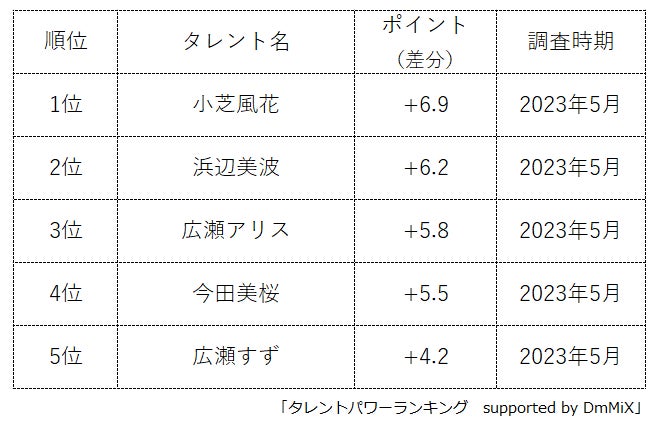 本ランキングは、2023年2月度と2023年5月度に実施したタレント調査データを利用し、タイトルに応じてランキング形式でまとめたものです。