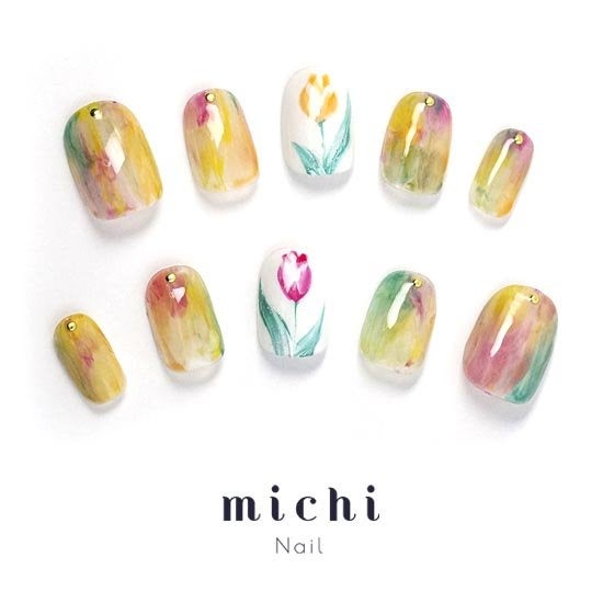 絵の具が混ざりあうような、カラフルな色合いが可愛いこちらのネイル。中指にはホワイトのベースに左右違う色のチューリップが描かれています。パッと目を惹くチューリップの花と個性的なカラフルネイルで誰ともかぶらないワンランク上のおしゃれが楽しめます。