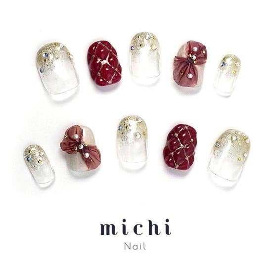 ぷっくりしたキルティングデザインが可愛いネイル。ゴールドのグラデに散らばったストーン、大きなリボンなど見ているだけで気分が上がるデザインです。パーティーや記念日デートなど、ここぞというときに使いたいゴージャスネイルです。
