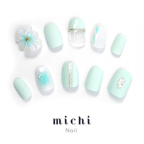 ブルーグリーンとホワイトカラーの淡くてかわいい色合いに、大きなフラワーが目を惹くネイル。マット仕上げのベースにオーロラやシルバーラメが輝きます。全体的に爽やかな印象で、初夏にぴったりのネイルチップです。