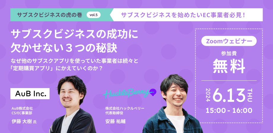 株式会社ハックルベリー(東京都世田谷区、代表取締役社長:安藤 祐輔、以下「ハックルベリー」)は、AuB株式会社(東京都中央区、代表取締役:鈴木 啓太、以下「AuB」)と、「サブスクビジネスの成功に欠かせない3つの秘訣 〜なぜ他のサブスクアプリを使っていたEC事業者は続々と「定期購買アプリ」にかえていくのか?〜」をテーマにオンラインイベントを開催することをお知らせします。