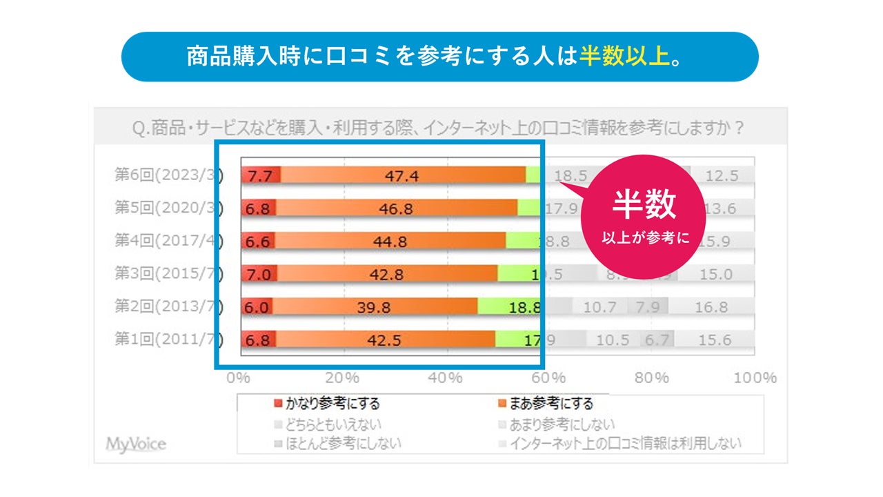 今や商品の販促に口コミは必要不可欠なものとなっており、商品・サービスの購入・利用時にネット上の口コミ情報を参考にする人は約半数以上に上ります。