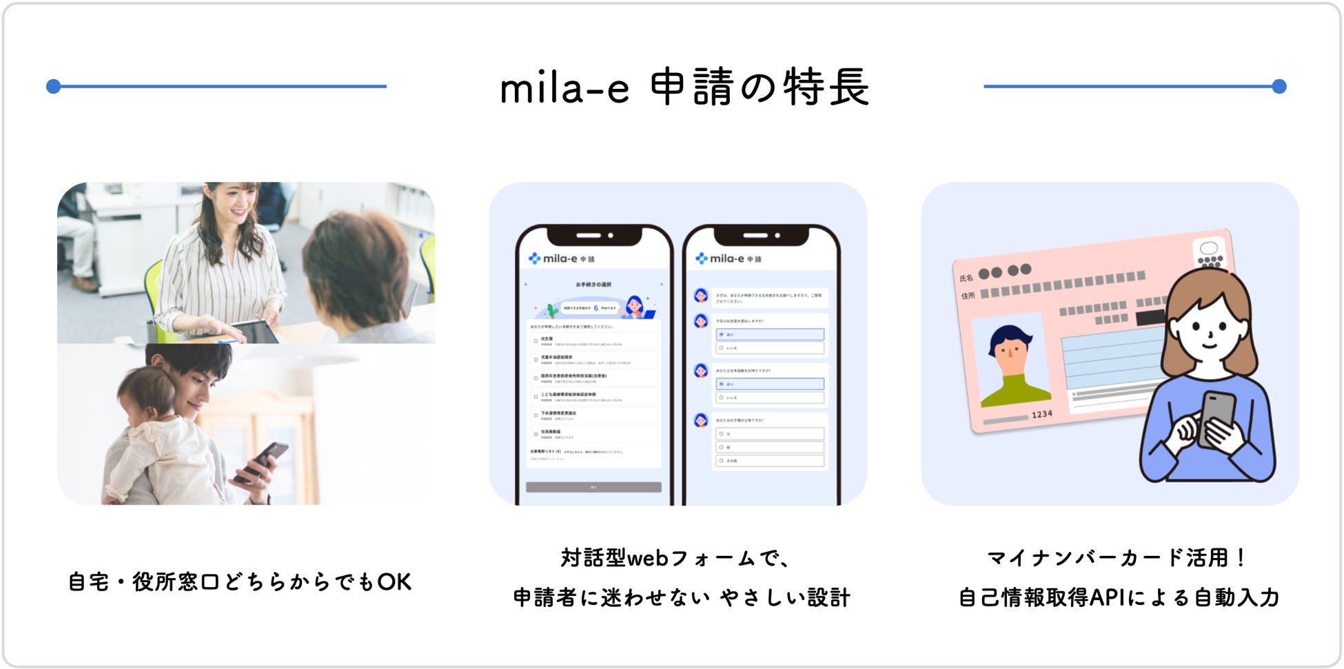 「mila-e(ミライー) 申請」は、自治体窓口DXサービスです。 これまでは役所窓口で紙書類に手書きをしていた行政手続きに関して、タブレット・スマートフォンから電子申請ができます。複数の手続きをまとめて1回の入力で済ませることができるため、手書きの手間が省けるほか複数の窓口を回って順番を待つ必要がなく、住民の利便性につながります。