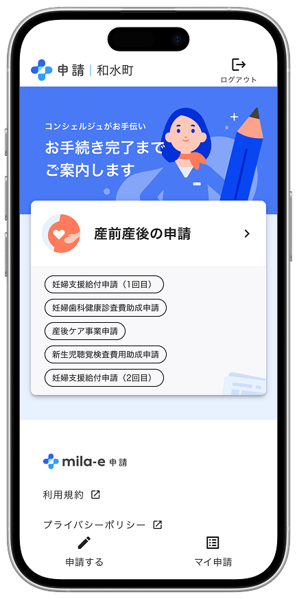mila-e 申請は、自治体窓口DXサービスです。複数手続きをまとめて1回、スマートフォン等で申請できる[出生届ワンスオンリー]や、「mila-e クーポン」と組み合わせて、産後ケア事業でご利用いただいております。