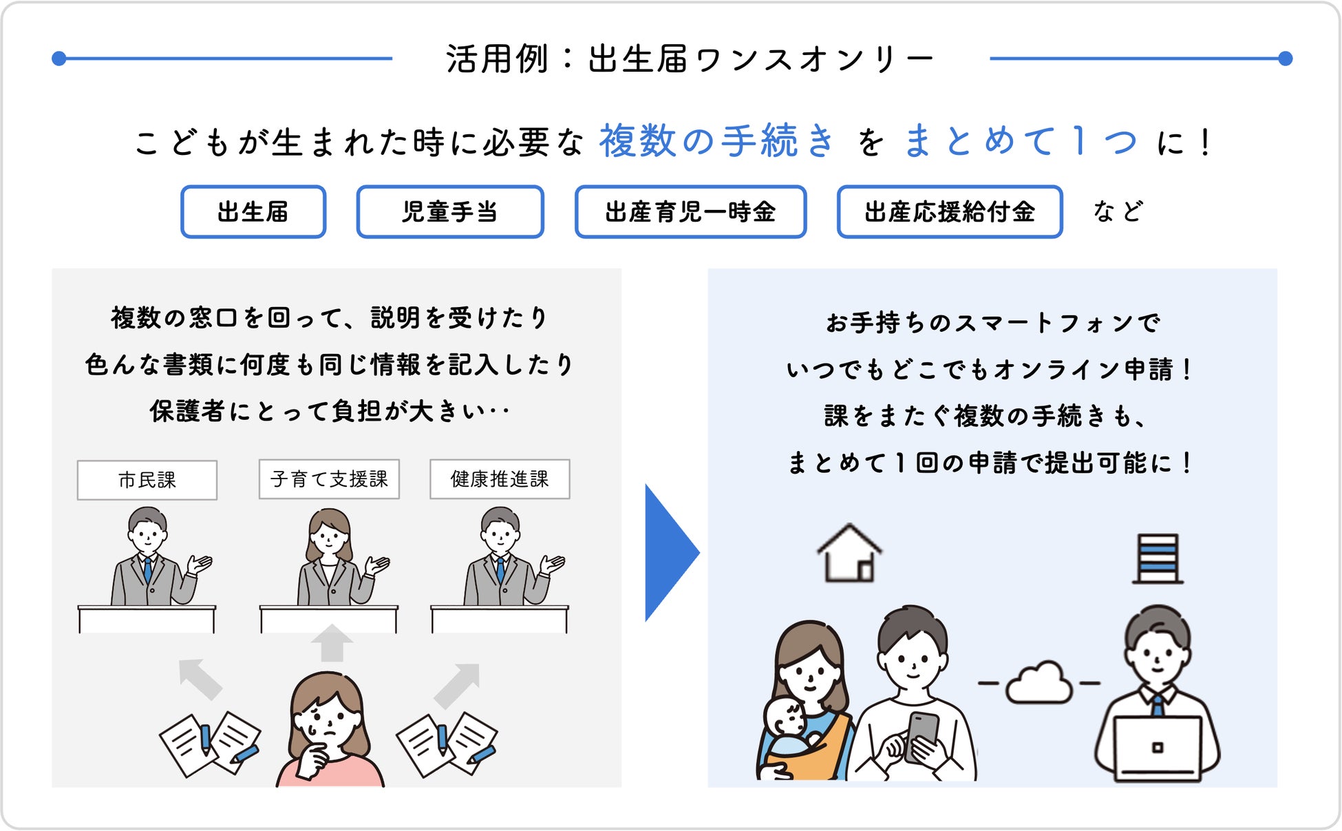 和水町では、これまで対象の申請手続きは全て紙書類への手書きで行っており、個人情報など重複した内容を何度も記入する必要がありました。このことから、手書きする手間がかかるほか、内容確認に時間を要するために待ち時間が発生するなど、申請手続きのため来庁する子育て家庭の負担になっていました。