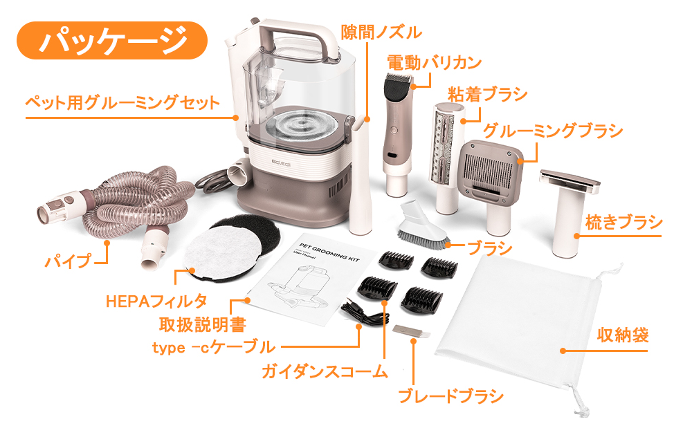 「グルーミングブラシ」「梳きブラシ」「電動バリカン」「粘着ブラシ」「隙間ノズル」5種類のアタッチメントを備え、ペットケア、掃除の両方に気を配ります。ガードコームは3mm・6mm・9mm・12mmを用意して、毛をカットしながら吸引されます。