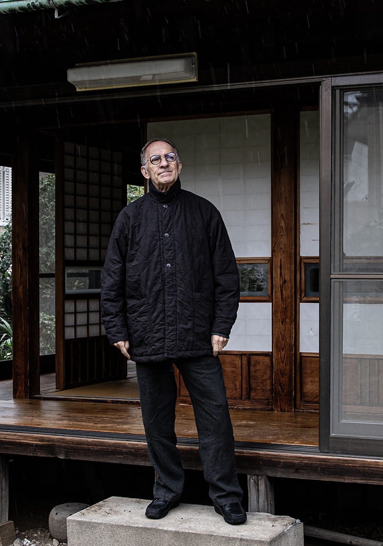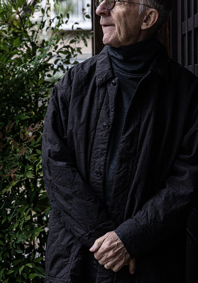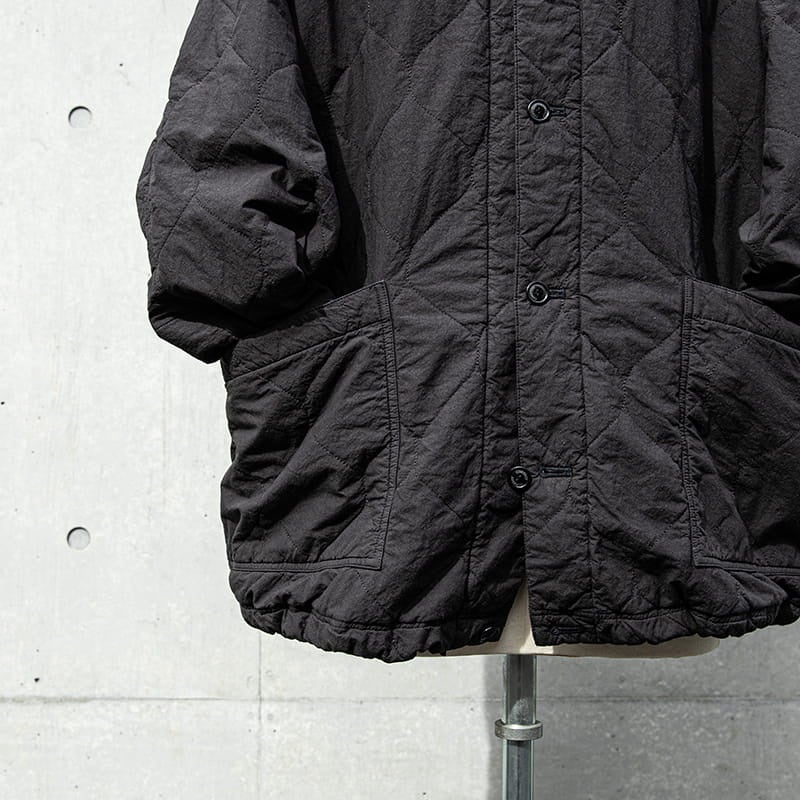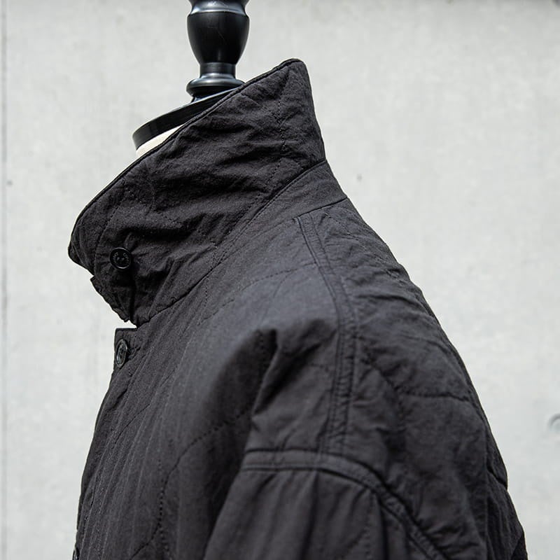 近江晒し加工が施されたコットンラミータイプライターをシェルにした中綿キルトを採用。ボックス型のジャケットを、インクブラックカラーに「製品染め」しました。動きのある生地とキルトステッチが生かされ、シンプルなデザインながら、表情豊かに仕上がりました。