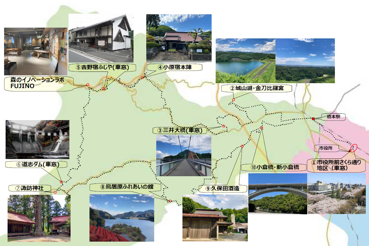 市役所前さくら通り地区(車窓) ➞ 城山湖・金刀比羅宮 ➞ 三井大橋(車窓) ➞ 小原宿本陣 ➞ 吉野宿ふじや(車窓) ➞ 森のイノベーションラボFUJINO(昼食) ➞ 道志ダム(車窓) ➞ 諏訪神社 ➞ 鳥居原ふれあいの館 ➞ 久保田酒造 ➞ 小倉橋・新小倉橋