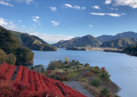 宮ケ瀬湖にかかる虹の大橋とやまなみが美しいスポット。虹の大橋は、長さ330mのアーチ橋で、「かながわの橋100選」に選定されています。見ごろとなる真っ赤なドウダンツツジと湖畔の景観を楽しみました。