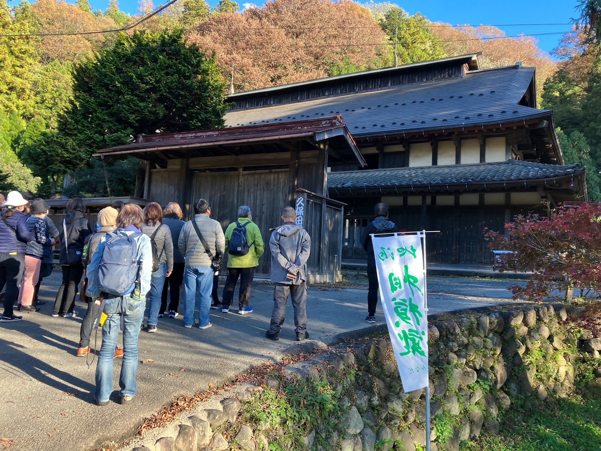 丹沢山系の湧水を用いて、日本酒「相模灘」の製造を行っている久保田酒造。久保田本家は築130年といわれており、切妻に近い入母屋づくりと呼ばれる形式で建てられ、「かながわの建築物100選」に登録されています。山々の紅葉と歴史を背負う建物が醸し出す風情を味わいました。