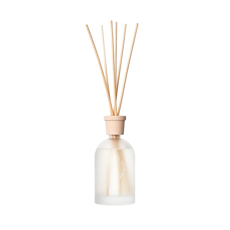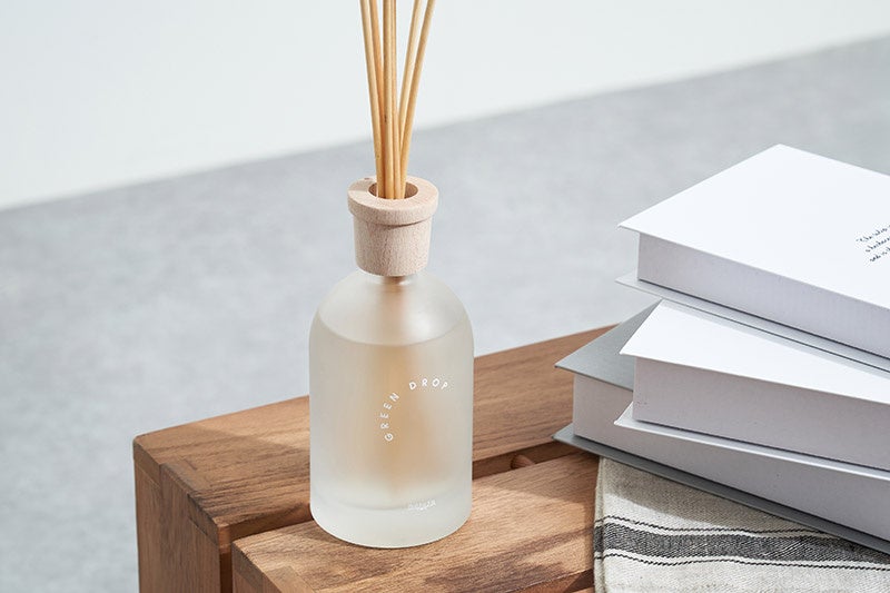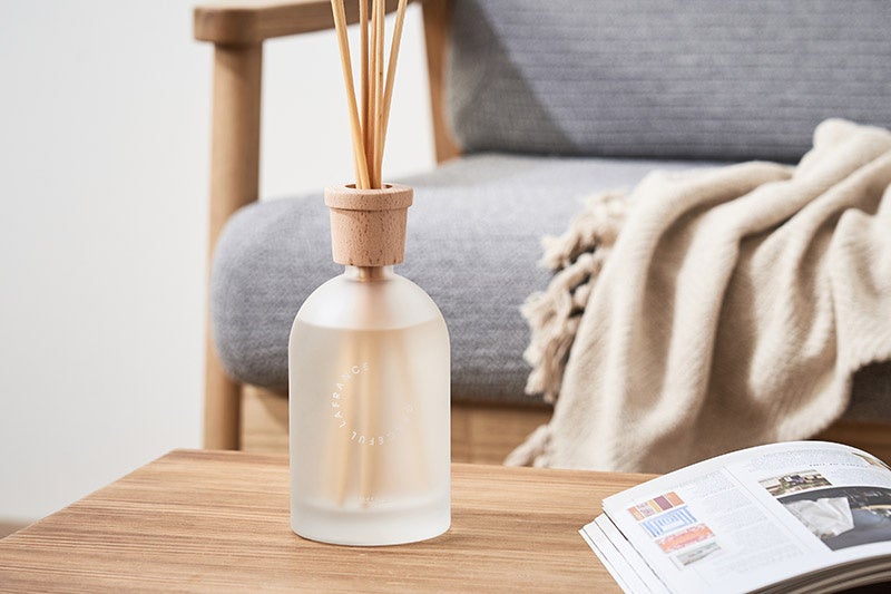 スモークガラスにウッドリングをあしらった北欧テイストのデザインが魅力のリードディフューザー。不意の転倒による液漏れを避けるため、倒れてもこぼれにくい液漏れ防止の