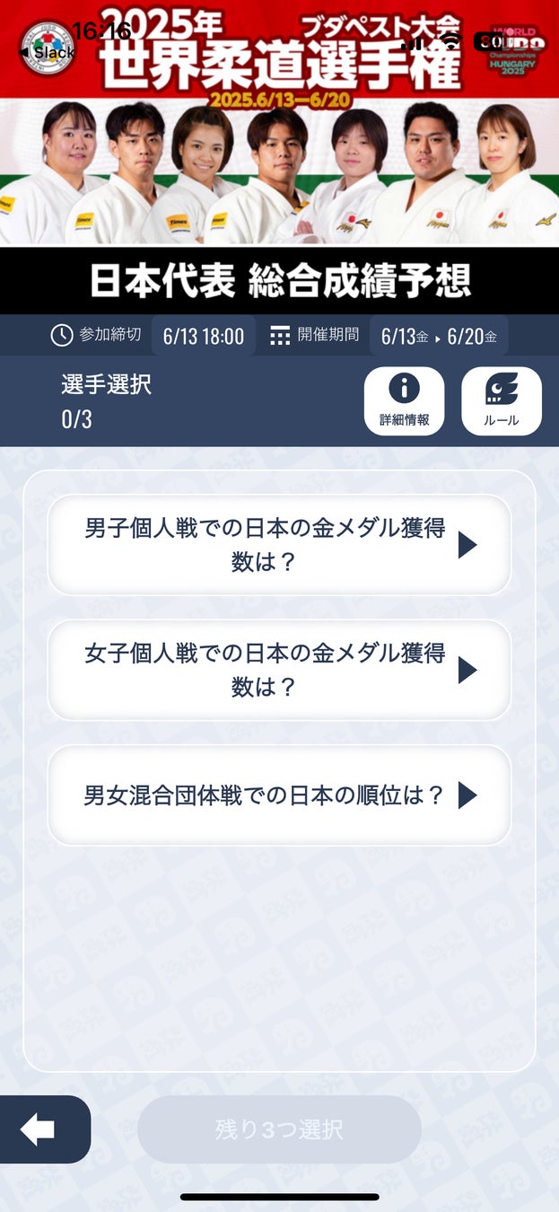 イノベーションの力で新たなスポーツ・エンターテインメントを創造し、まだ見ぬ感動と熱狂を提供するアプリ「なんドラ」を運営する株式会社なんでもドラフト(本社:東京渋谷区、代表:森井啓允)は、昨年に引き続き今年も公益財団法人全日本柔道連盟と提携し、日本時間の6月13日(金)〜20日(日)にブタペストで行われる柔道『2025年ブダペスト世界柔道選手権大会』の結果予想企画を開催中です。