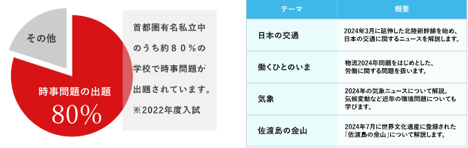 近年、時事問題は大半の学校で出題されています。特に社会ではその傾向が顕著で、2022年度の入試では、首都圏有名私立中のうち約80%の学校で時事に関する問題が出題されました。難関中をめざすのであれば、時事問題の対策は、やって当たりまえのものになっています。