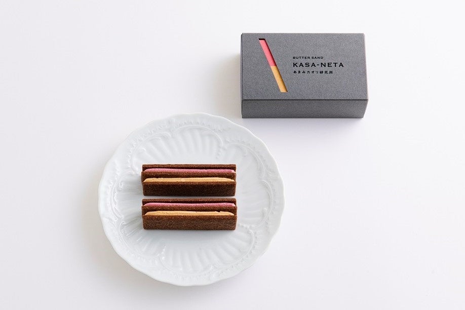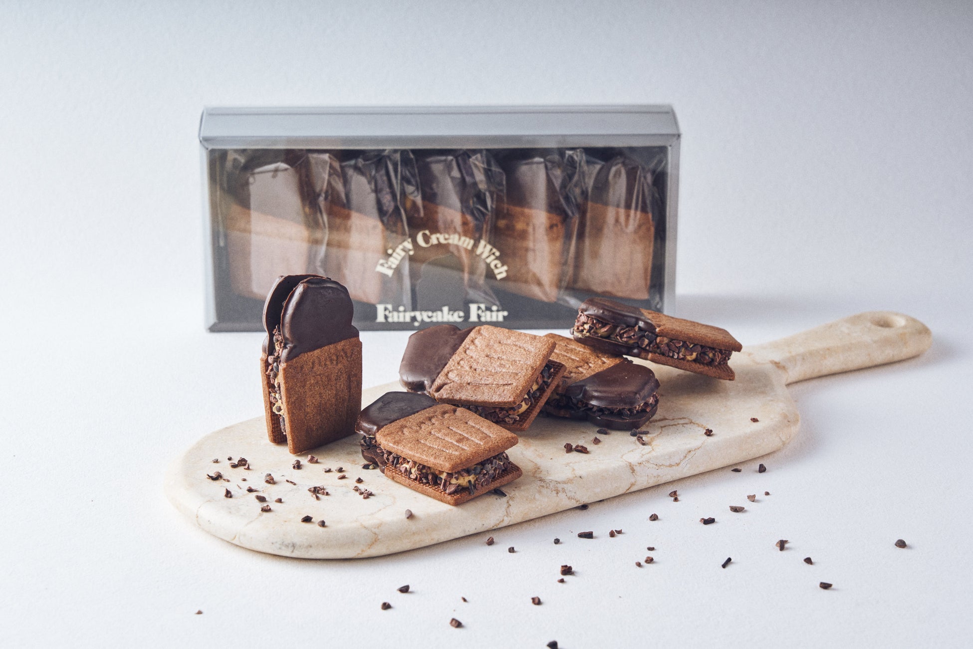 自家製「塩キャラメルソース」入りの生バタークリームをダークチョコレートがけしたカカオビスケットでサンドした贅沢な味わい。ほろ苦いカカオニブがアクセント。