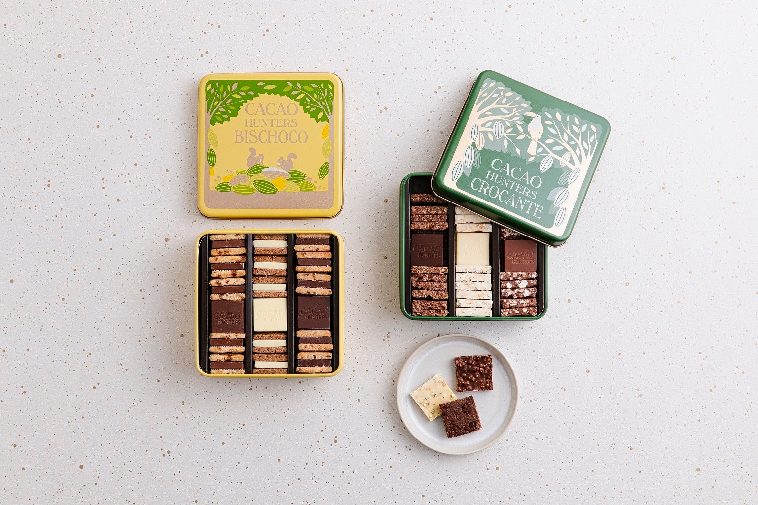 ハンターズの香り高いハイカカオチョコレート3種類をベースに、サブレでサンドした「ビスチョッコ」と、ナッツなどを練りこんだザクザク食感の「クロカンテ」。鮮やかなカラーの缶がキュートでギフトにもおすすめ。