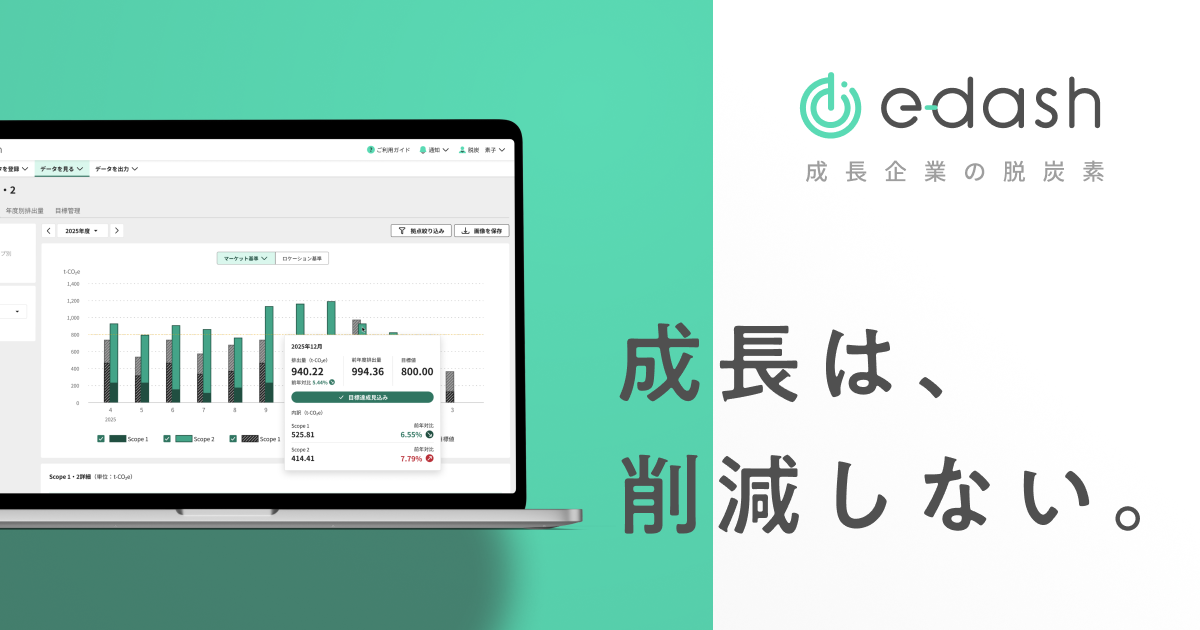 「e-dash」は、CO2排出量削減への取り組みを総合的にサポートする三井物産発のサービスプラットフォームです(※1)。