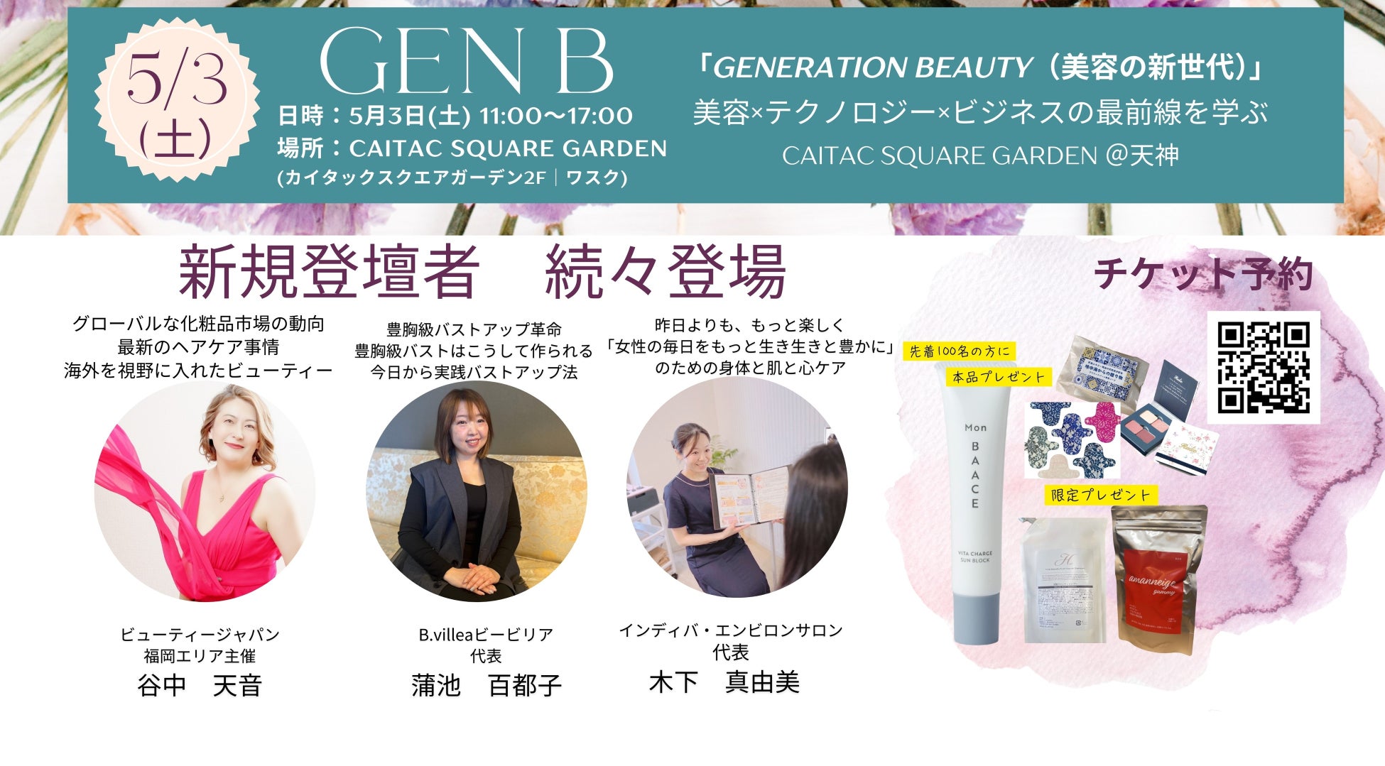 美容×テクノロジー×ビジネスの最前線を学ぶことができる本イベント「GENERATION BEAUTY(GEN B)」に、新たに3名の登壇者が決定いたしましたので、お知らせいたします。