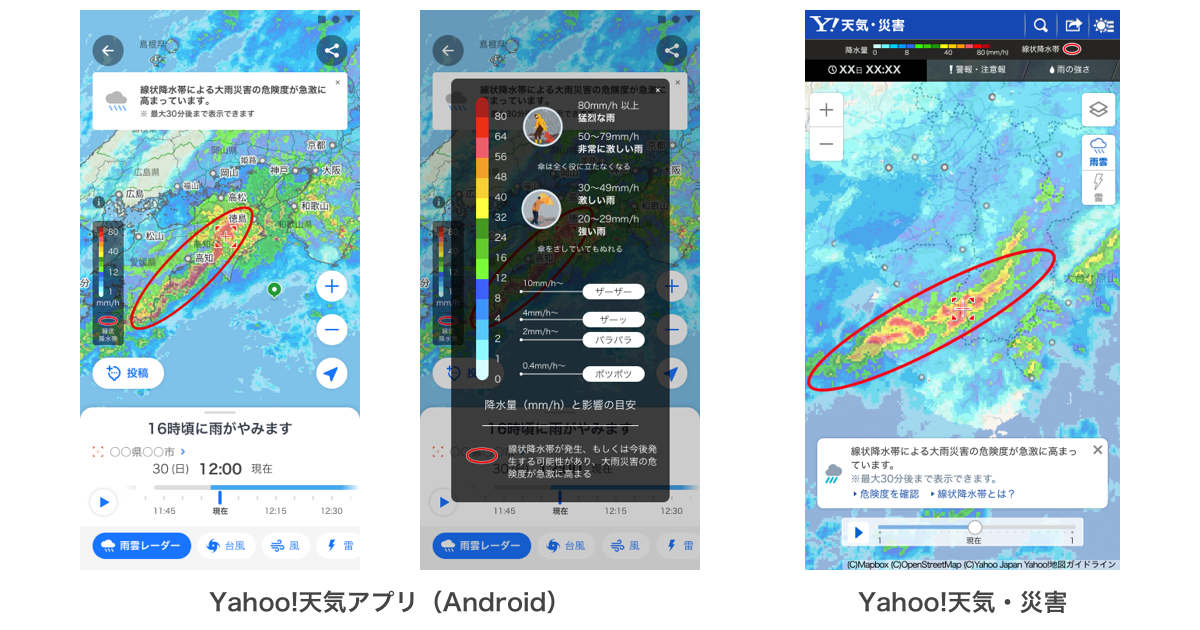 そこで、「Yahoo!天気」アプリと「Yahoo!天気・災害」では、線状降水帯がもたらす豪雨への警戒を高め、ユーザーに対して早めの防災行動を促すことを目的に、本機能の提供を開始しました。