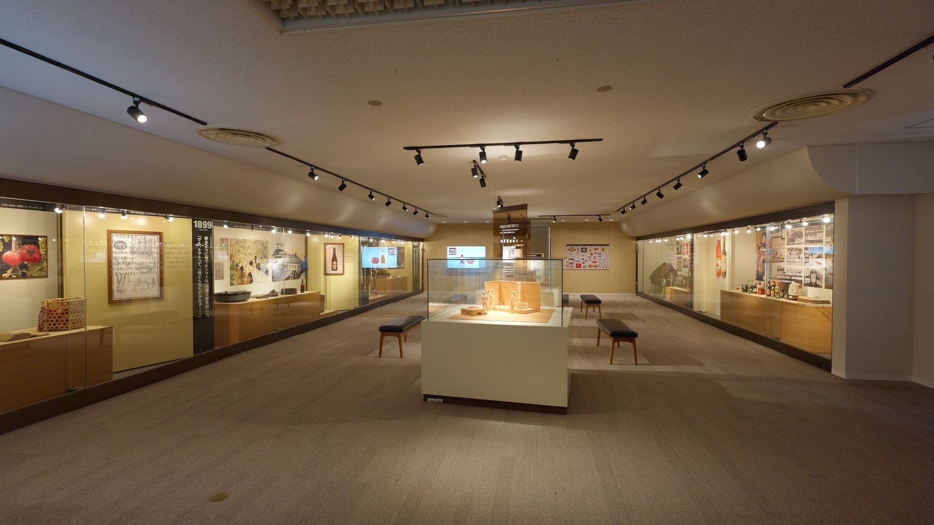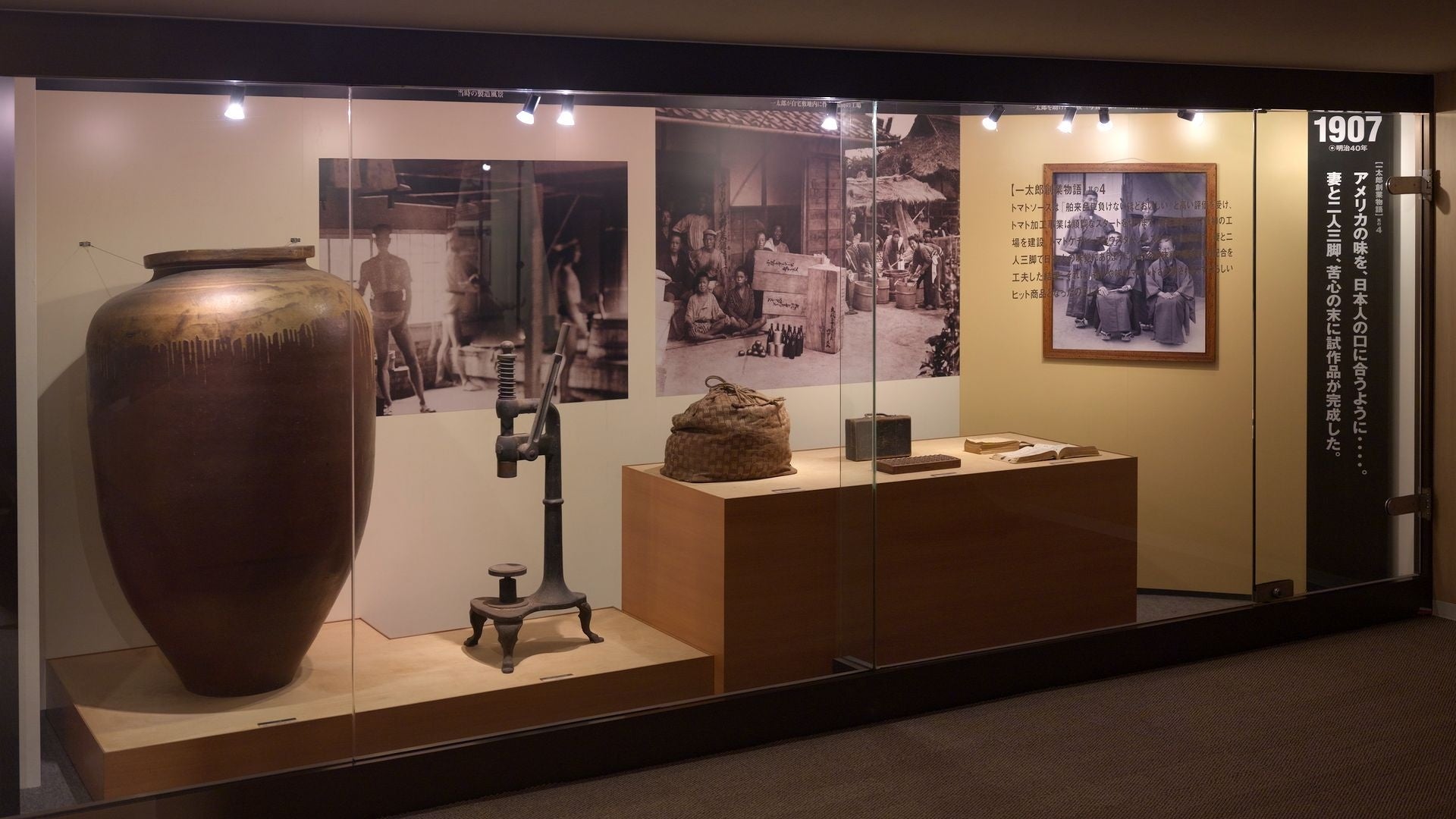 本館では、一太郎がトマト加工業を起業した経緯や、その挑戦の軌跡を今に伝える施設として、一太郎の遺品をはじめ、当社創業当時の書類や器具、さらに当時の商品ラベルや広告宣伝物などを展示しています。