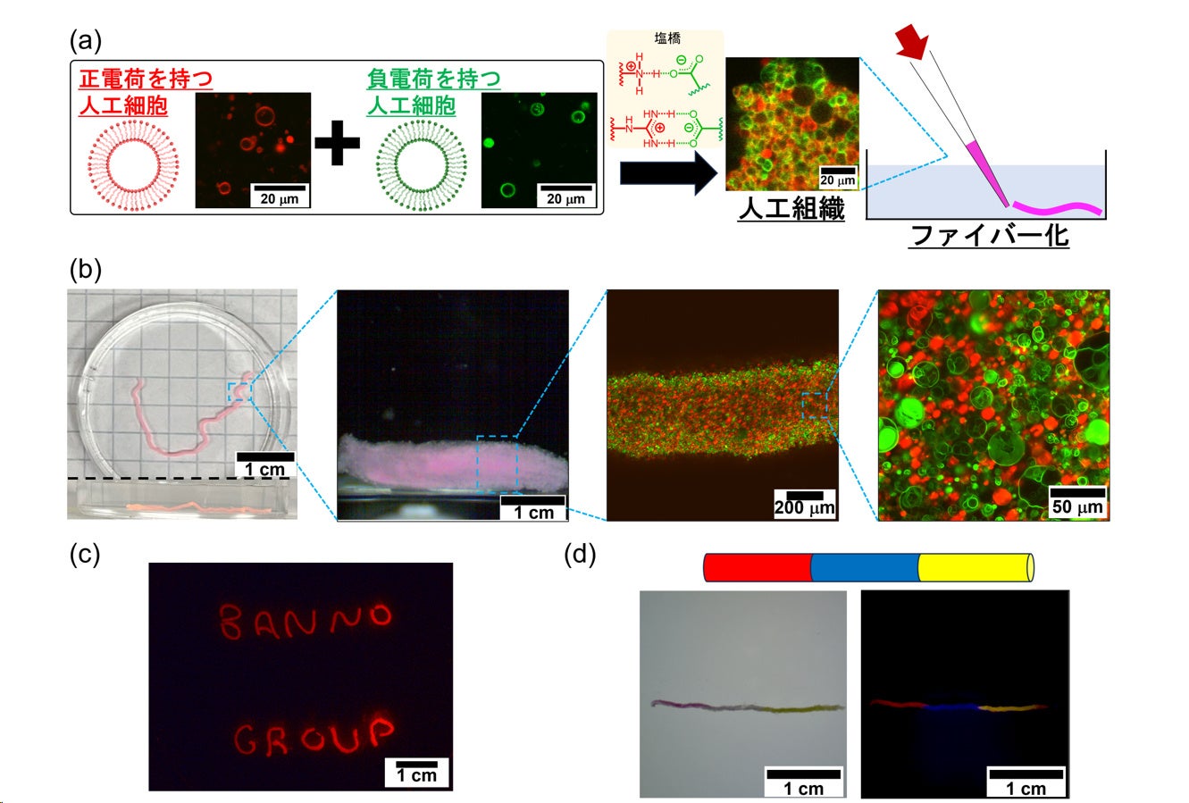 慶應義塾大学大学院理工学研究科の小島知也(博士課程3年)、同大学理工学部の朝倉浩一 教授、伴野太祐 准教授とトリエステ大学(イタリア)のピエランジェロ・ゴッボ准教授らの研究グループは、多数の人工細胞からなる人工組織をファイバー状に成形する新たな手法の開発に成功しました。その結果、従来困難であった人工組織の形状や配置の制御が可能となり、人工組織の動きの制御や内部での化学物質の伝播といった機能の創出にも成功しました。本研究の成果は、2025年2月10日に米国科学雑誌『Advanced Science』に掲載されました。