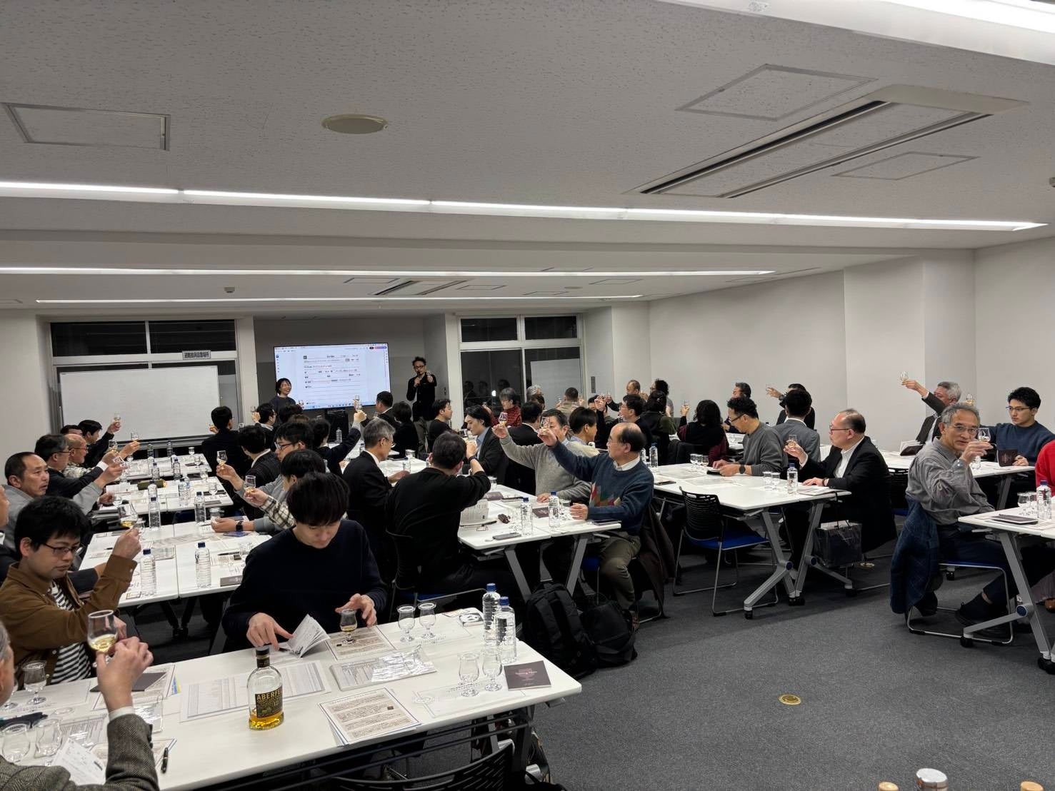 2026年1月30日(金)19:00-20:30にウイスキー文化研究所セミナールーム(東京都渋谷区)にて初開催。ウイスキースクール常連から初参加の初心者まで56名が参加しました。企画担当者よりテイスティングノートの使い方や企画趣旨の説明後、基準となるウイスキーを全員で試飲し、ゲストの倉島氏によるテイスティングコメントを発表。その後、参加者は引換券を使用して好きなアイテムをテイスティング。黙々とノートにテイスティングコメントを書く方や、偶然同じテーブルになった愛好家同士で好みのウイスキーやブランデーを共有するなどして、自由な時間を過ごしていただきました。各テーブルにゲストの倉島氏がお声がけして、参加者からのテイスティングについての質問にお答えいただきました。
