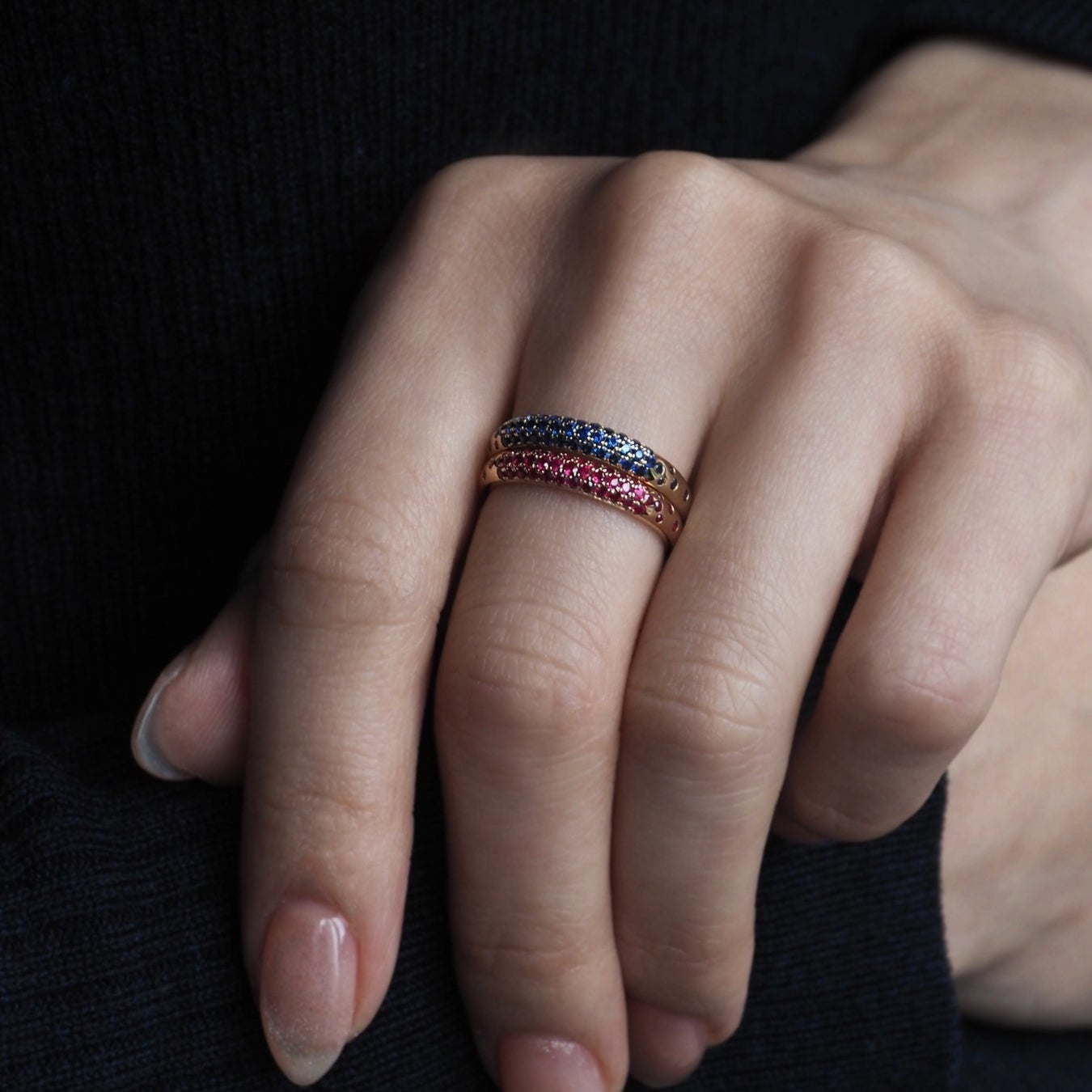 モザンビーク産ルビーは、明るさを含んだ濃密な真紅が印象的です。スリランカ産ブルーサファイアは、深く澄んだ青が静かな存在感をたたえています。ひとつの色だけで描くことで、石そのものの個性がより際立ち、印象も明瞭に立ち上がります。