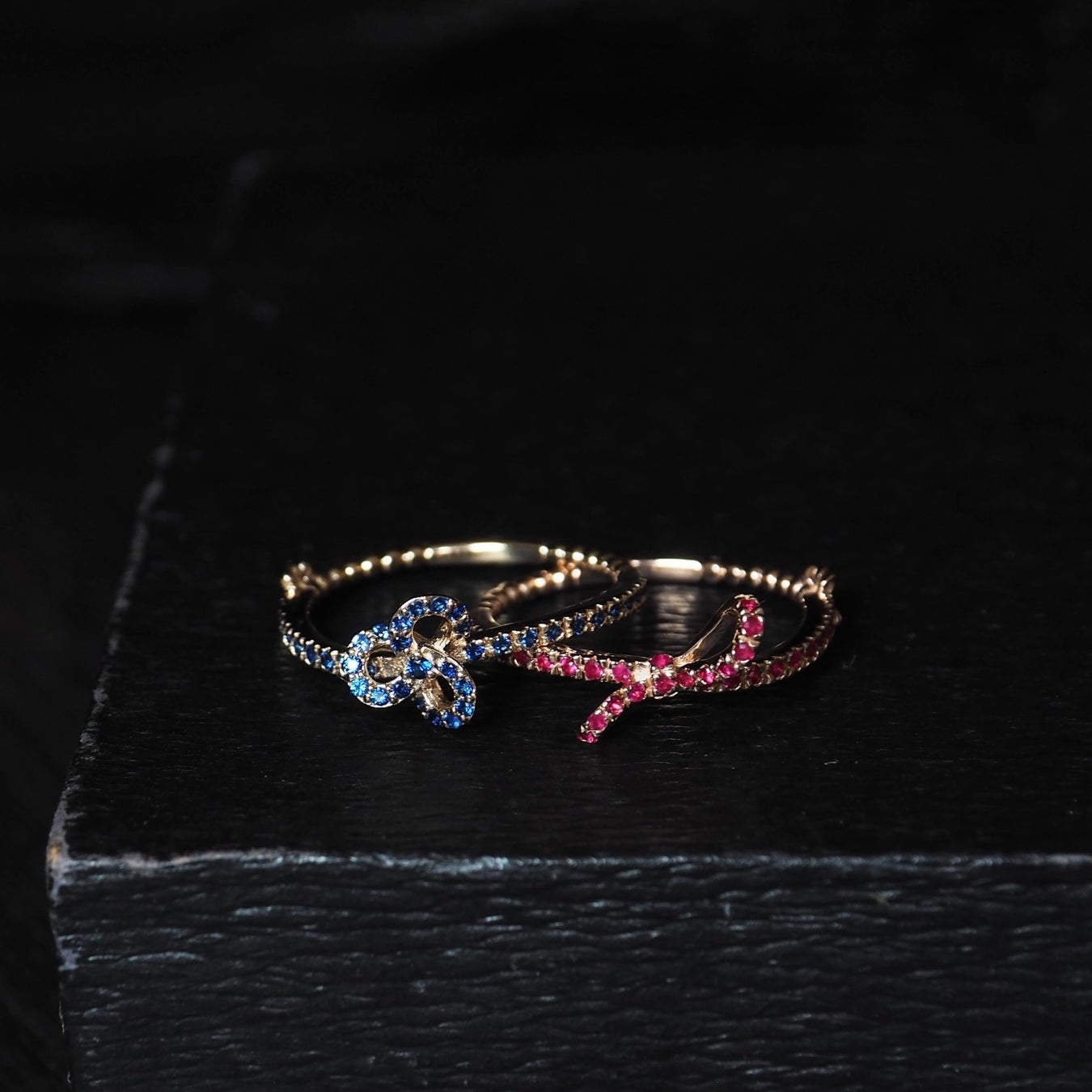 ルビーには、肌になじみやすいK10ピンクゴールドを合わせ、やわらかな艶を引き出しております。ブルーサファイアは、K10イエローゴールドとホワイトゴールドの2種類をご用意し、合わせる地金によって青の見え方にわずかな違いが生まれ、表情に奥行きをもたらします。