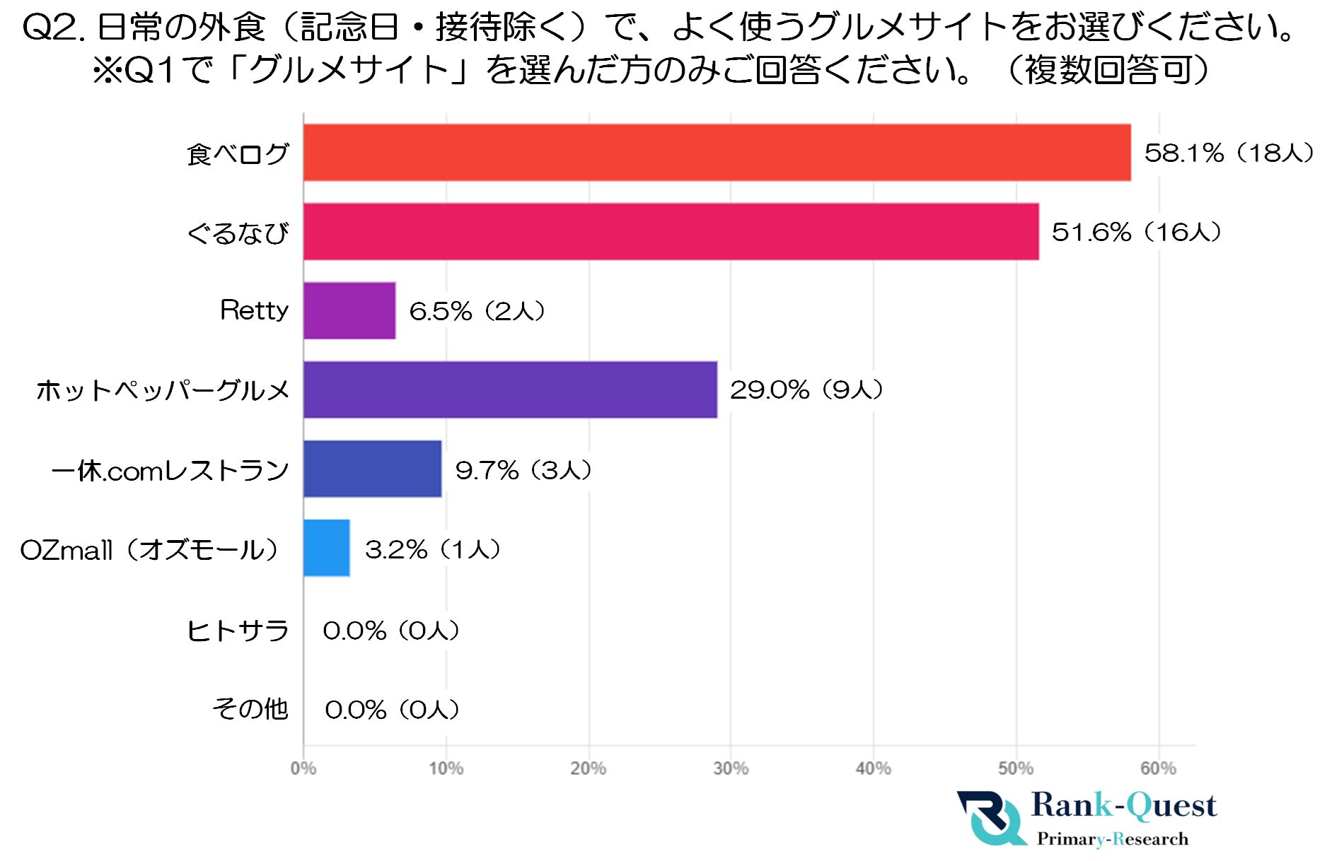 2.日常の外食(記念日・接待除く)で、よく使うグルメサイトをお選びください。※Q1で「グルメサイト」と回答した人が対象(複数回答可:注2)