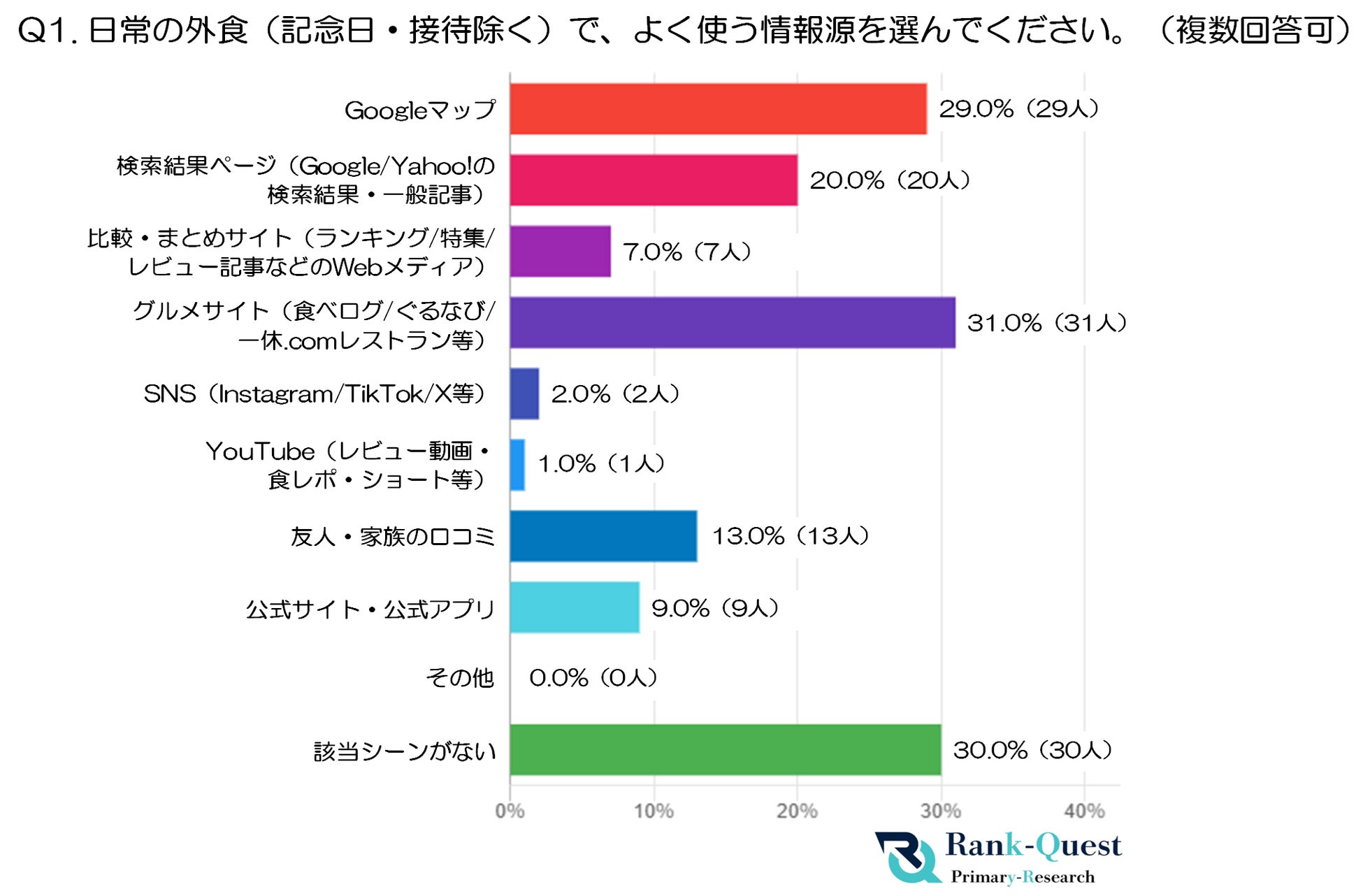 「該当シーンがない」以外で、最も多かったのは「グルメサイト(食べログ・ぐるなび・一休.comレストラン等)」(29.0%・29人)でした。記念日や接待といった“失敗できない外食シーン”では、口コミや評価を参考に信頼性を重視する傾向が強く見られます。