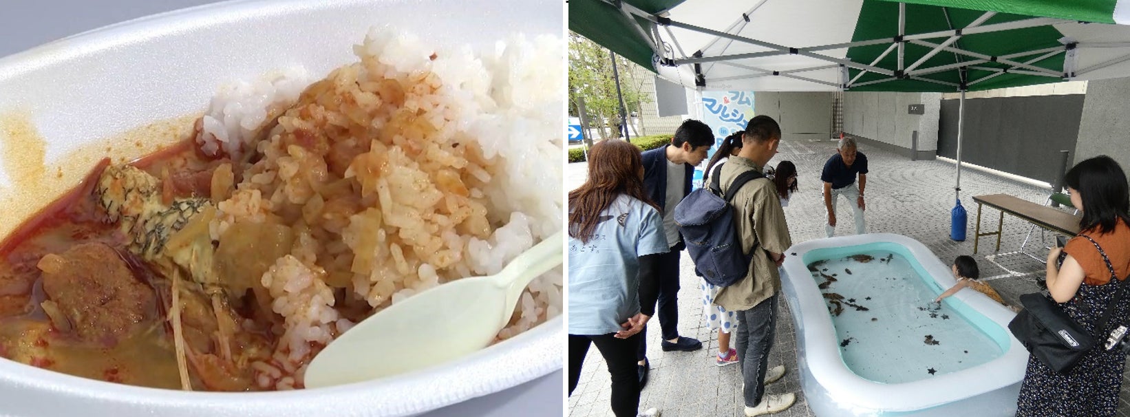 会場の外では、海のマルシェを開催!海のフォーラムで紹介したクロダイを使ったメニューや、寿司のキッチンカー、とれたての海の生き物と触れ合えるタッチングプールなどが集まりました。