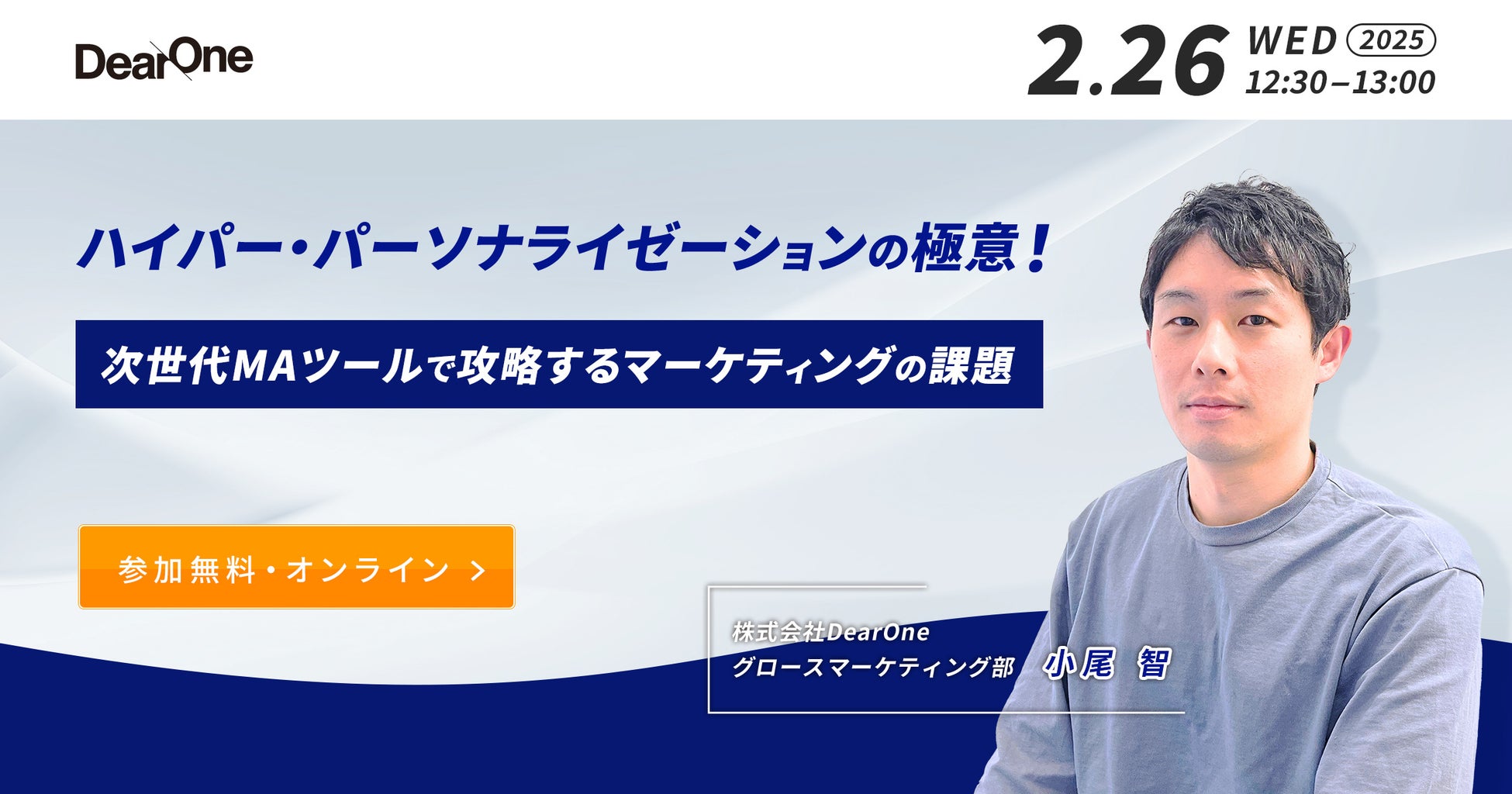 株式会社NTTドコモのマーケティング分野における新規事業型子会社である株式会社DearOne(本社:東京都港区、代表取締役:河野 恭久、以下:DearOne)は、「次世代のMAツールを活用したハイパー・パーソナライゼーション」をテーマに2025年2月26日(水)に無料ウェビナーを開催します。