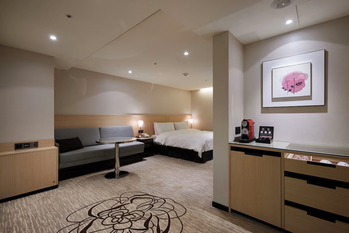 「K ホテルズ台北 チャンアン」は、台北市の中山地区に位置し、MRT松江南京駅から徒歩約3分の好立地で観光やビジネス利用に最適です。モダンで清潔感のある室内のほか、24時間コーヒーが楽しめるラウンジやランドリー室を完備しており、長期滞在にもぴったりなホテルです。