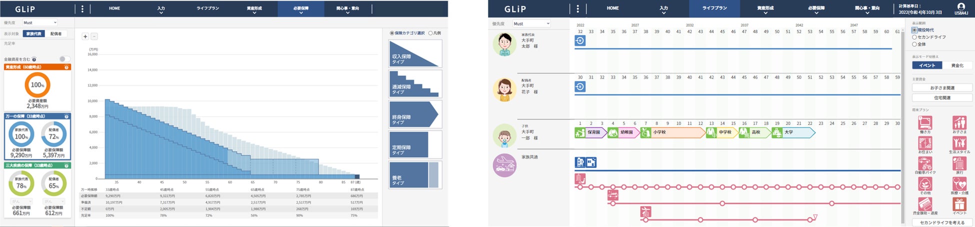 当社は、人生100年時代に対応したお客さま一人ひとりのライフプランを提供するため、2022年10月2日から、次世代のライフプラン分析システム「GLiP」(グリップ、Goal based Life Planning Support Serviceの略)をリリースしました。「ライフプランニング授業」にGLiPを活用することで、住宅・教育・介護施設等のリアルデータによりイメージを膨らませ、夢やありたい姿を描くことに繋がります。また、必要金額を円グラフや数値でシンプルにより分かりやすく表示できるようになりました。