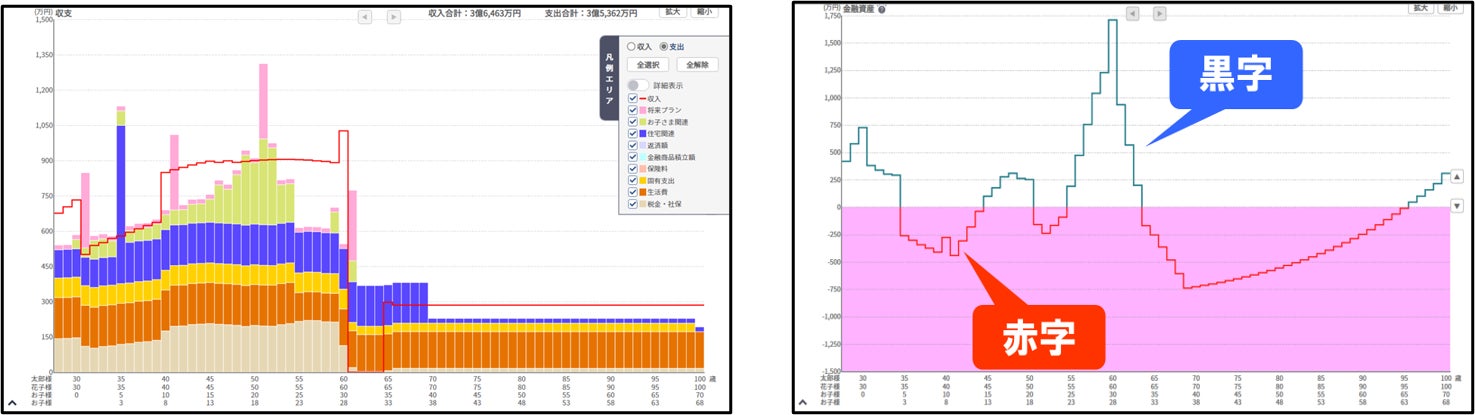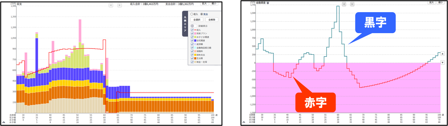 左図:1年毎の収支の流れ、右図:世帯の貯蓄の変化