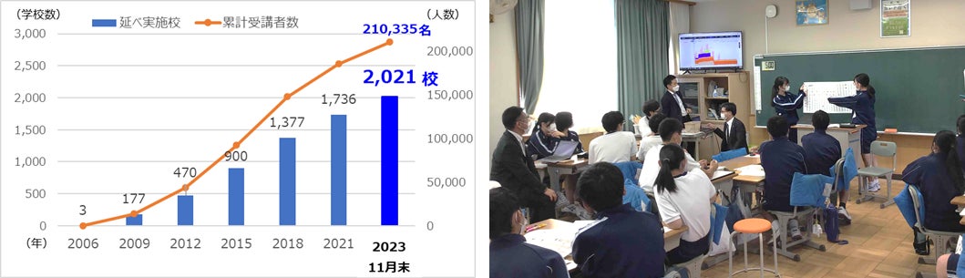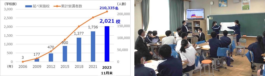 この度、「ライフプランニング授業」の実施校数が延べ2,000校を超え(2,021校)、受講者数は210,335名、講師を務めたライフプランナーは延べ19,775名になりました(2023年11月末時点)。