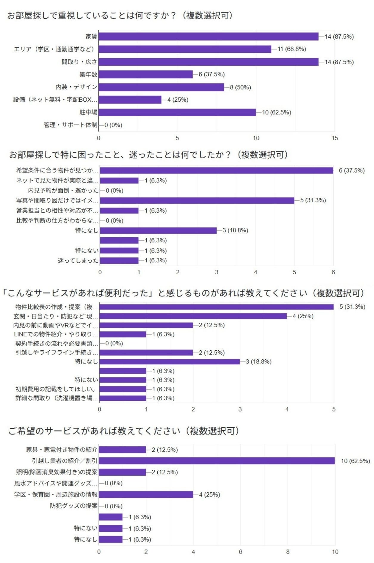 「こんなサービスがあれば便利だったと感じるもの」では、「物件比較表の作成・提案」(31.3%)「日当たり・防犯など現地視点の情報提供」(25%)が上位に挙がりました。