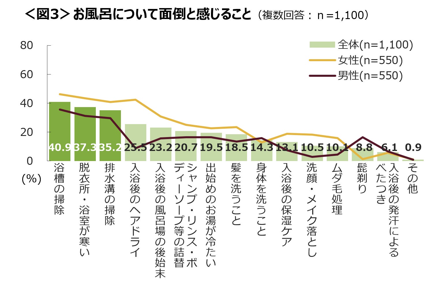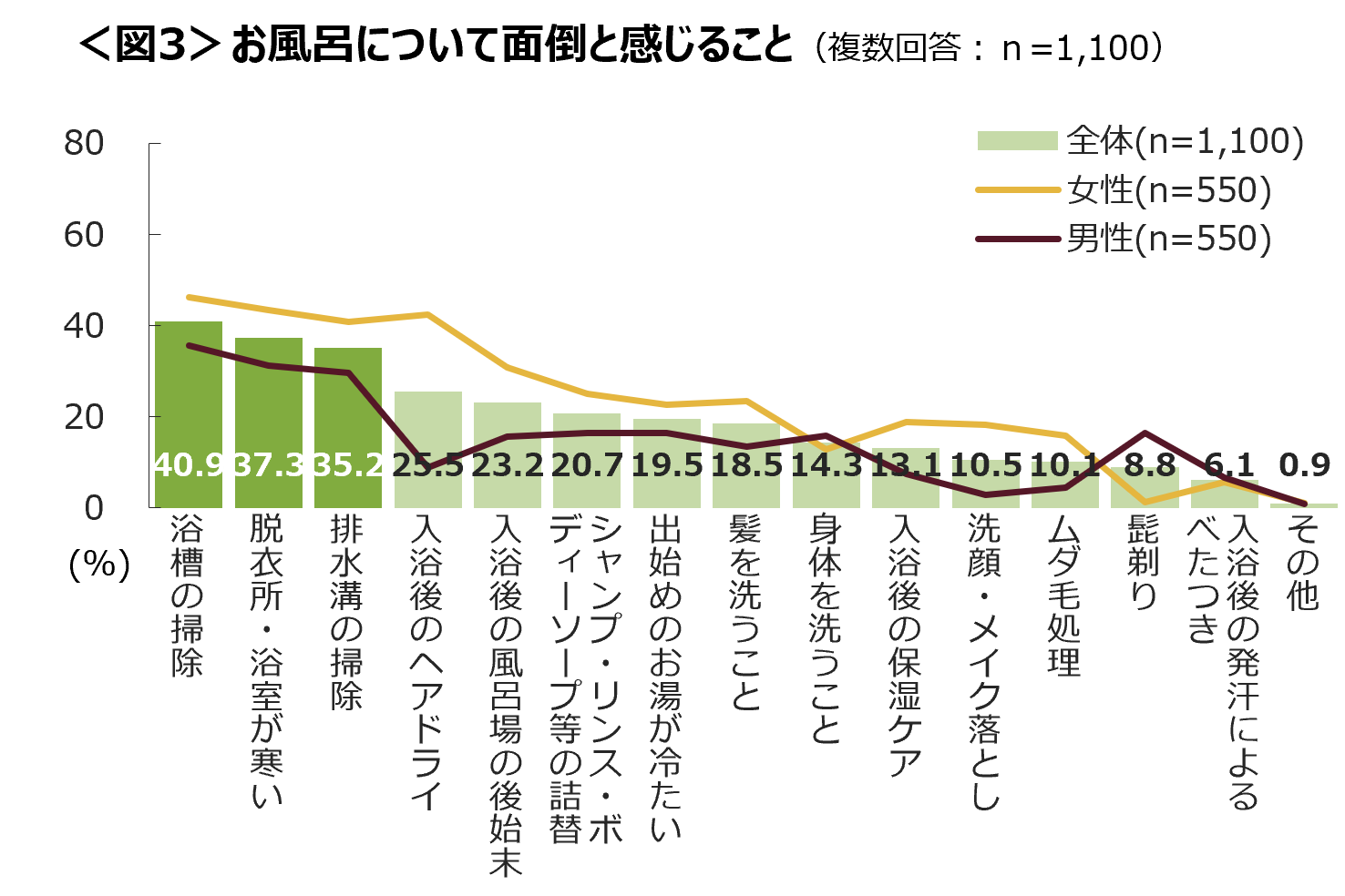 お風呂について面倒に感じることは、「浴室の掃除」「脱衣所・浴室が寒い」「排水溝の掃除」がTOP3で、掃除に関する点がハードルとなっている様子。 男性に比べ女性の方が面倒だと感じている項目が多い。加えて女性は入浴時にやること(ヘアドライ・洗顔・メイク落としなど)も多く、お風呂は好きでも面倒と感じられている要因と見受けられる。<図3>