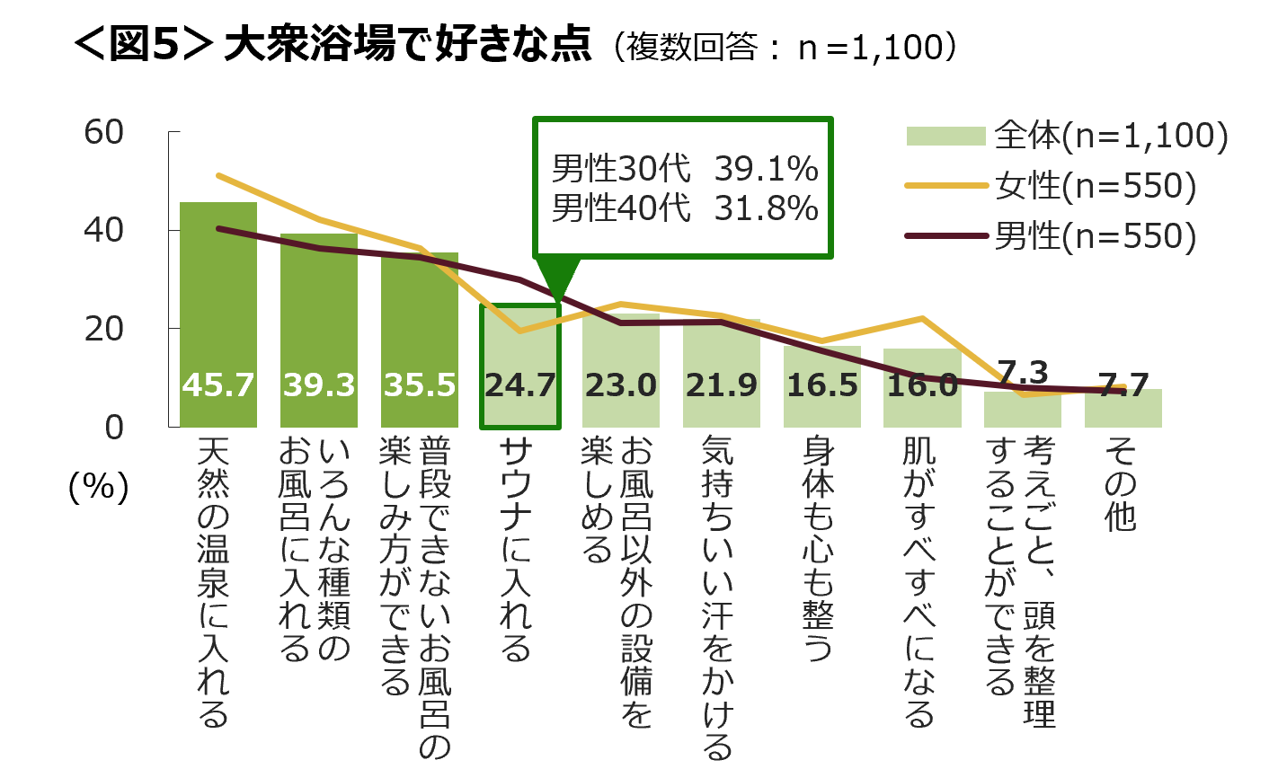 「サウナ」が4位に続き、特に男性30代では好きな点の1位であった。<図5>