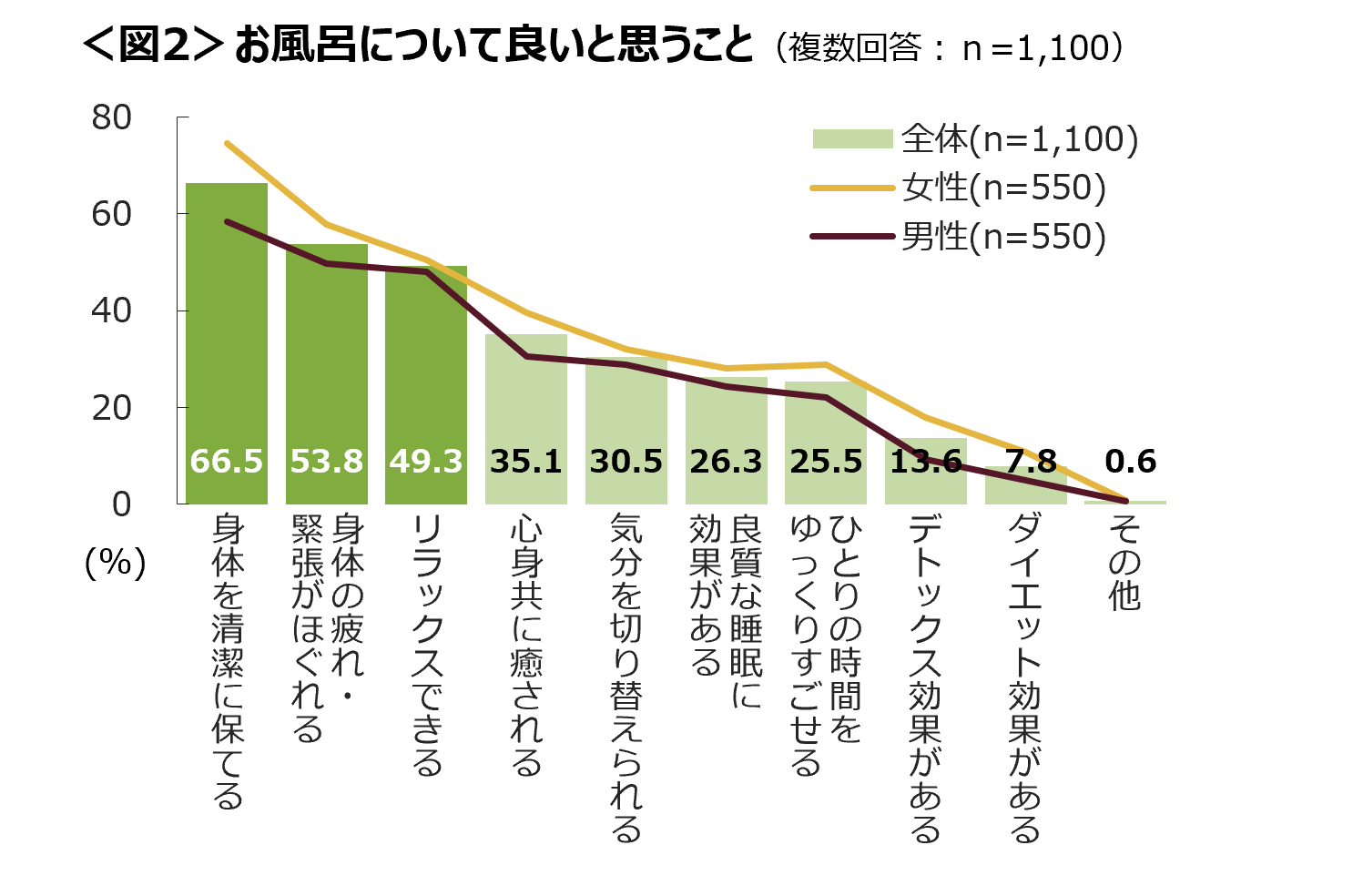 お風呂は「清潔を保てる」ほか、「身体の疲れ・緊張がほぐれる」「リラックスできる」「心身共に癒される」といった点が良いと好まれている。<図2>