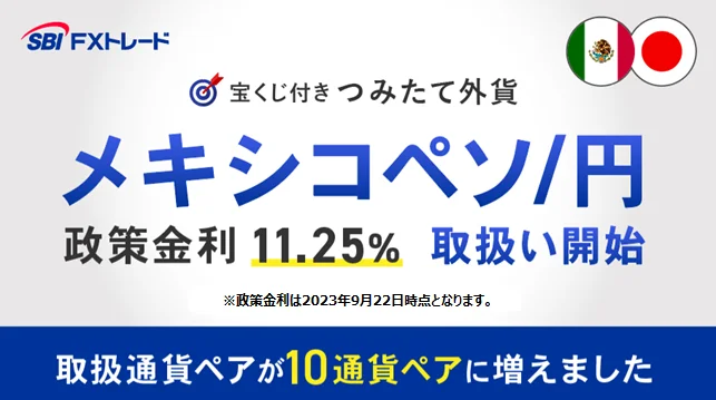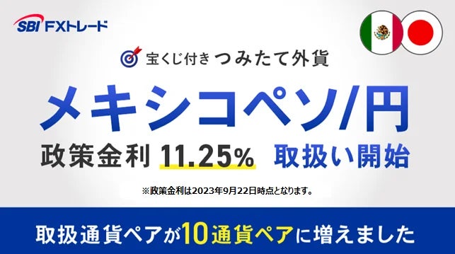 SBI FXトレード株式会社(本社:東京都港区、代表取締役社長:藤田 行生、https://www.sbifxt.co.jp/)は、2023年9月25日より「宝くじ付きつみたて外貨」の取扱い通貨ペアに「メキシコペソ/円」を追加いたしますのでお知らせいたします。