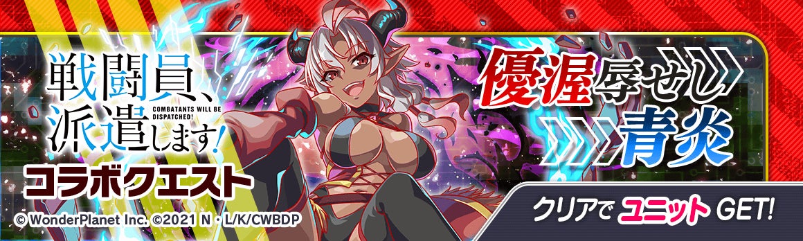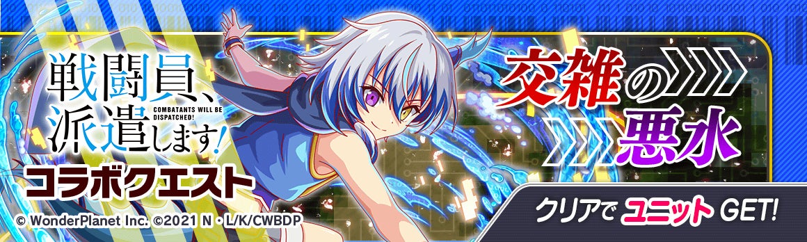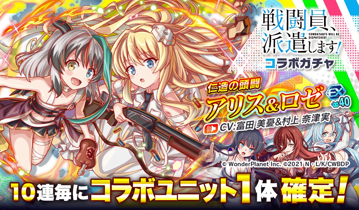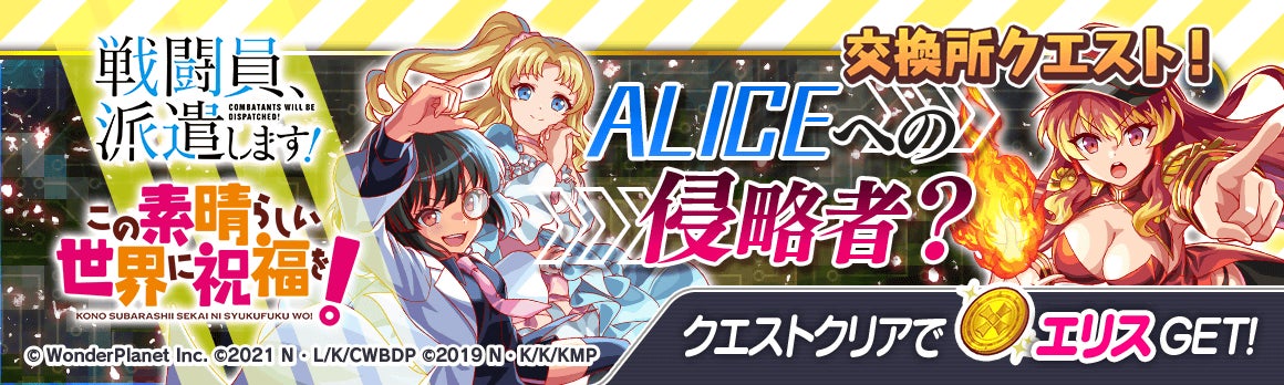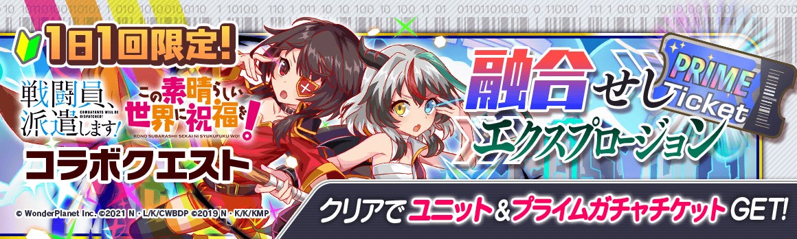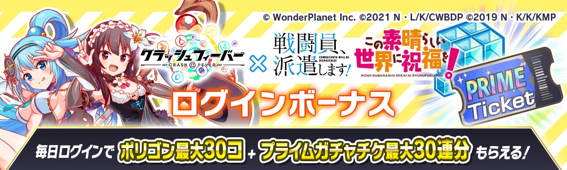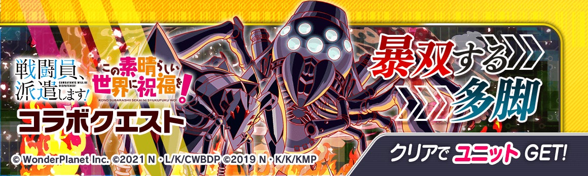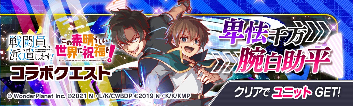 エンターテインメントサービス事業を行うワンダープラネット株式会社(本社:愛知県名古屋市、代表取締役社長CEO:常川友樹、東証マザーズ上場:証券コード4199、以下当社)は、iOS/Android端末向けに配信中のスマートフォンゲーム『クラッシュフィーバー』において『戦闘員、派遣します!』と『この素晴らしい世界に祝福を!』とのダブルコラボイベントの実施を決定したことをお知らせいたします。