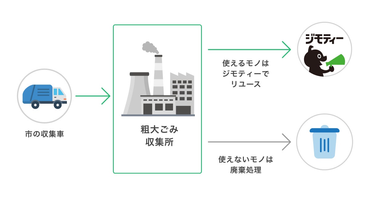 自治体が回収したモノのうち、再利用が可能なモノをジモティー内に設けた自治体の専用ページにて出品し、必要とする近隣住民とのマッチングを図ります。